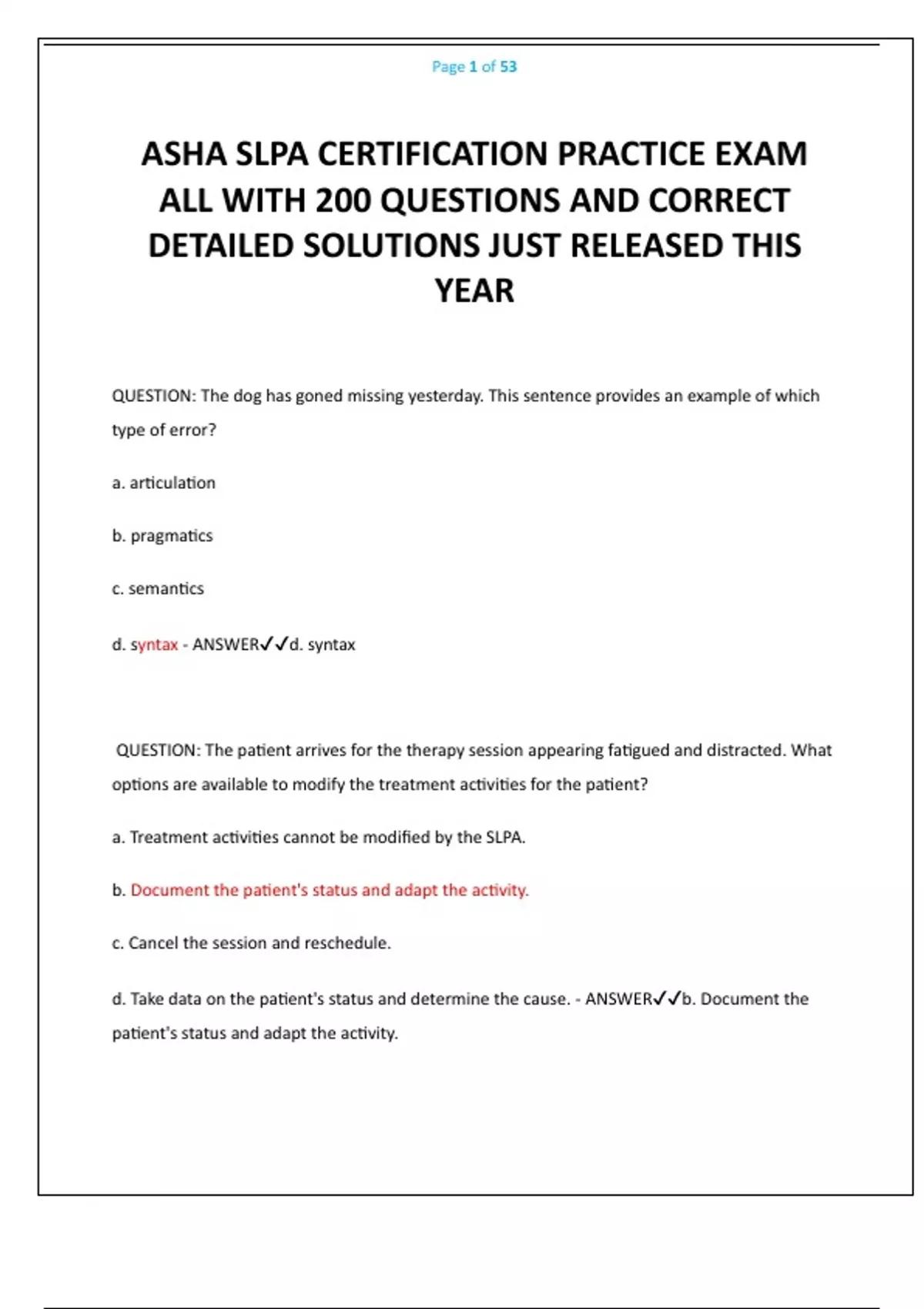 ASHA SLPA CERTIFICATION PRACTICE EXAM ALL WITH 200 QUESTIONS AND CORRECT DETAILED SOLUTIONS JUST RELEASED THIS YEAR