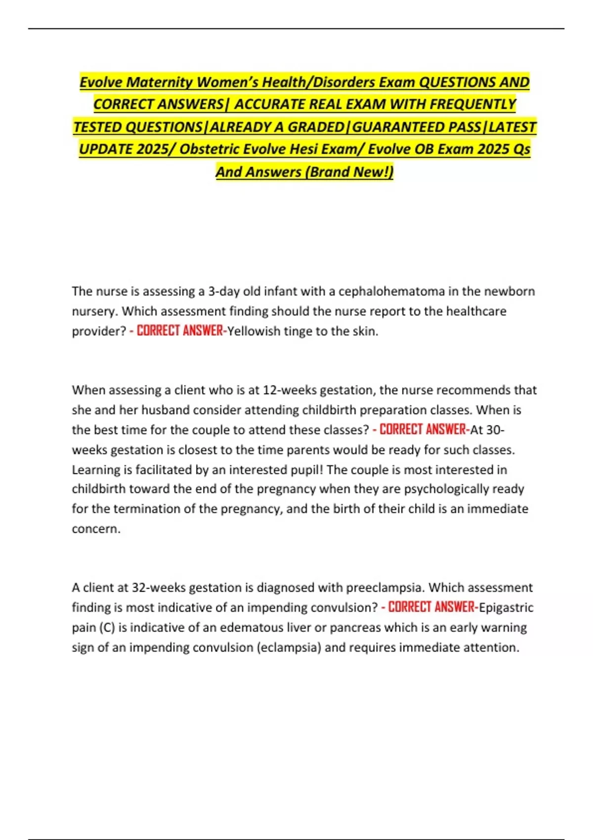 Evolve Maternity Women’s Health/Disorders Exam QUESTIONS AND CORRECT ANSWERS| ACCURATE REAL EXAM WITH FREQUENTLY TESTED QUESTIONS|ALREADY A GRADED|GUARANTEED PASS|LATEST UPDATE 2025/ Obstetric Evolve Hesi Exam/ Evolve OB Exam 2025 Qs And Answers (Bran