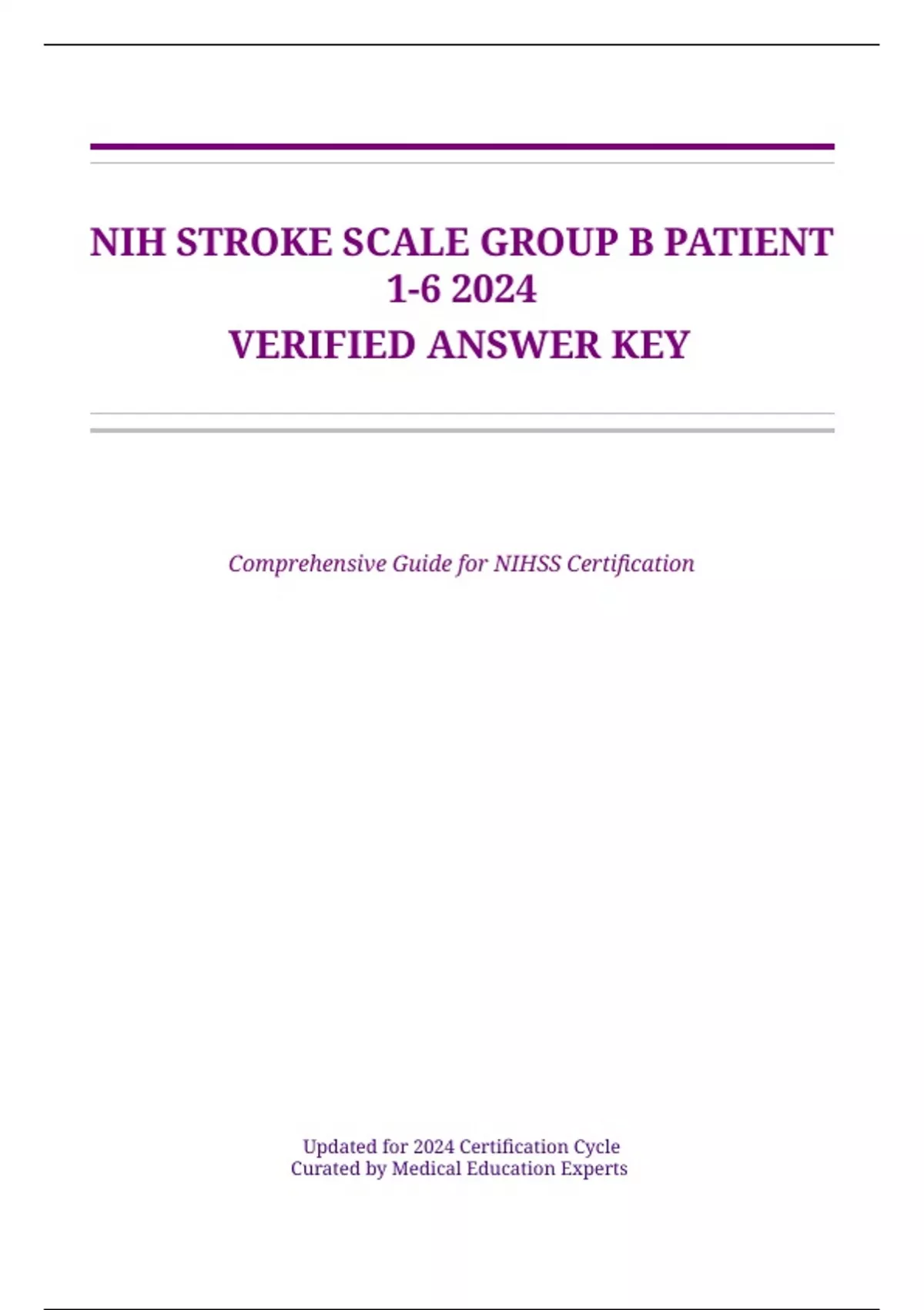 NIH STROKE SCALE GROUP B PATIENT 1-6 2024 VERIFIED ANSWER KEY Comprehensive Guide for NIHSS Certification Introduction This comprehensive guide provides a verified answer key for the NIH Stroke Scale (NIHSS) Group B, Patients 1-6, tailored for the 2024 certification cycle. The NIHSS is a standardized tool to assess stroke severity, scoring 11 items such as consciousness, motor skills, and language, with a total score from 0 (normal) to 42 (severe). This document includes 150 questions, covering scoring for Group B patients and related NIHSS concepts, sourced from platforms like Quizlet and Knoowy, ensuring alignment with 2024 standards. Presented in vibrant purple text with silver accents, it offers detailed explanations to support certification preparation.