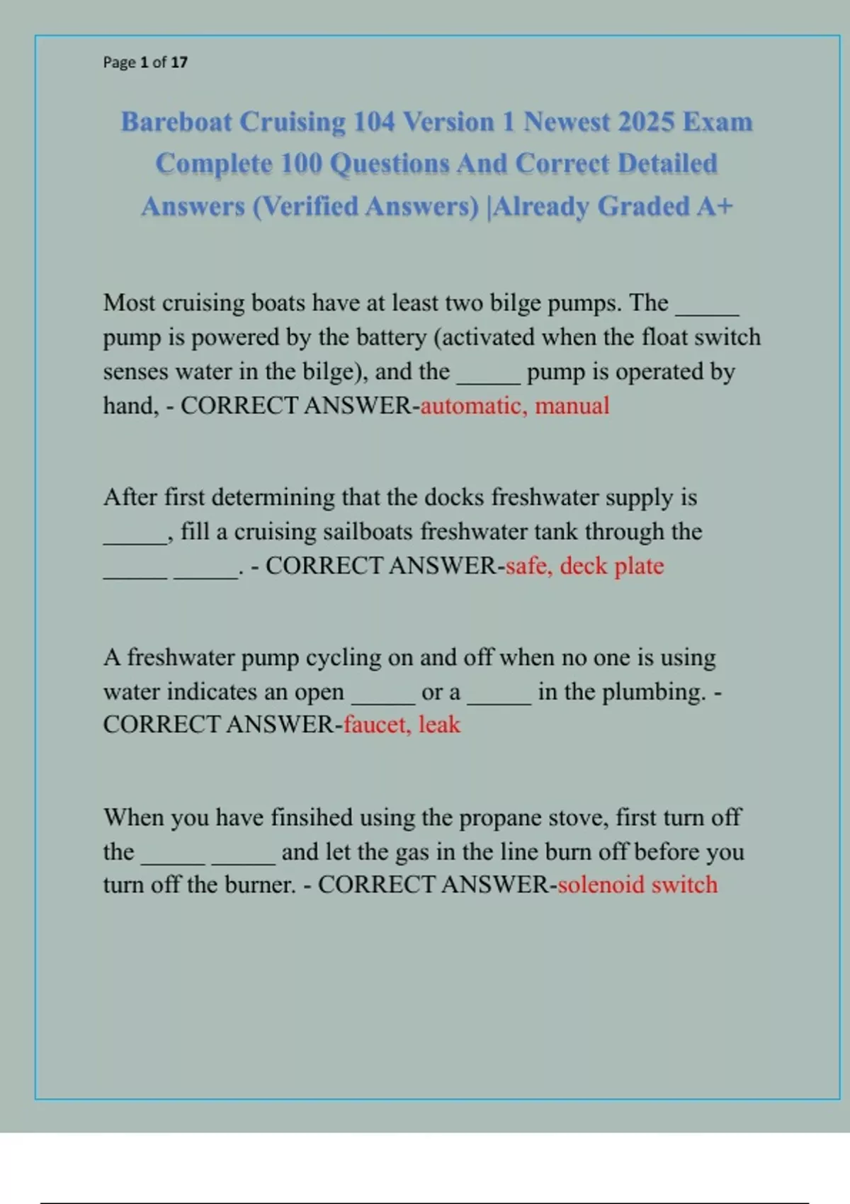 Bareboat Cruising 104 Version 1 Newest 2025 Exam Complete 100 Questions And Correct Detailed Answers (Verified Answers) |Already Graded A+