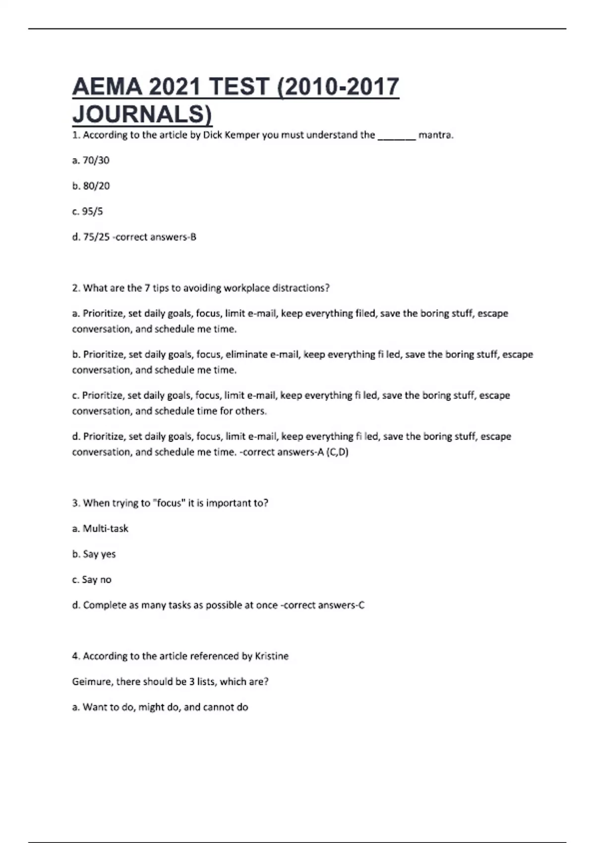 AEMA 2021 TEST ( JOURNALS) 1. According to the article by Dick Kemper you must understand the _______ mantra. a. 70/30 b. 80/20 c. 95/5 d. 75/25 -correct answers-B 2. What are the 7 tips to avoiding workplace distractions? a. Prioritize, set daily goals, focus, limit e-mail, keep everything filed, save the boring stuff, escape conversation, and schedule me time. b. Prioritize, set daily goals, focus, eliminate e-mail, keep everything fi led, save the boring stuff, escape conversation, and schedule me time. c. Prioritize, set daily goals, focus, limit e-mail, keep everything fi led, save the boring stuff, escape conversation, and schedule time for others. d. Prioritize, set daily goals, focus, limit e-mail, keep everything fi led, save the boring stuff, escape conversation, and schedule me time. -correct answers-A (C,D) 3. When trying to "focus" it is important to? a. Multi-task b. Say yes c. Say no d. Complete as many tasks as possible at once -correct answers-C 4. According to the article referenced by Kristine Geimure, there should be 3 lists, which are? a. Want to do, might do, and cannot do
