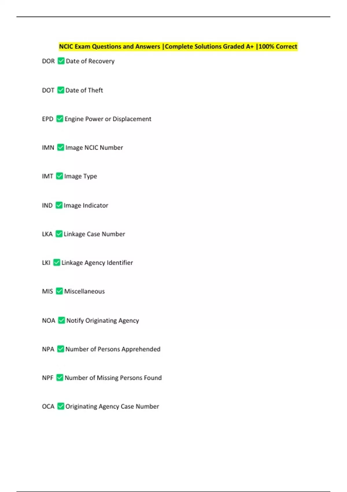 NCIC Exam Questions and Answers |Complete Solutions Graded A+ |100% Correct