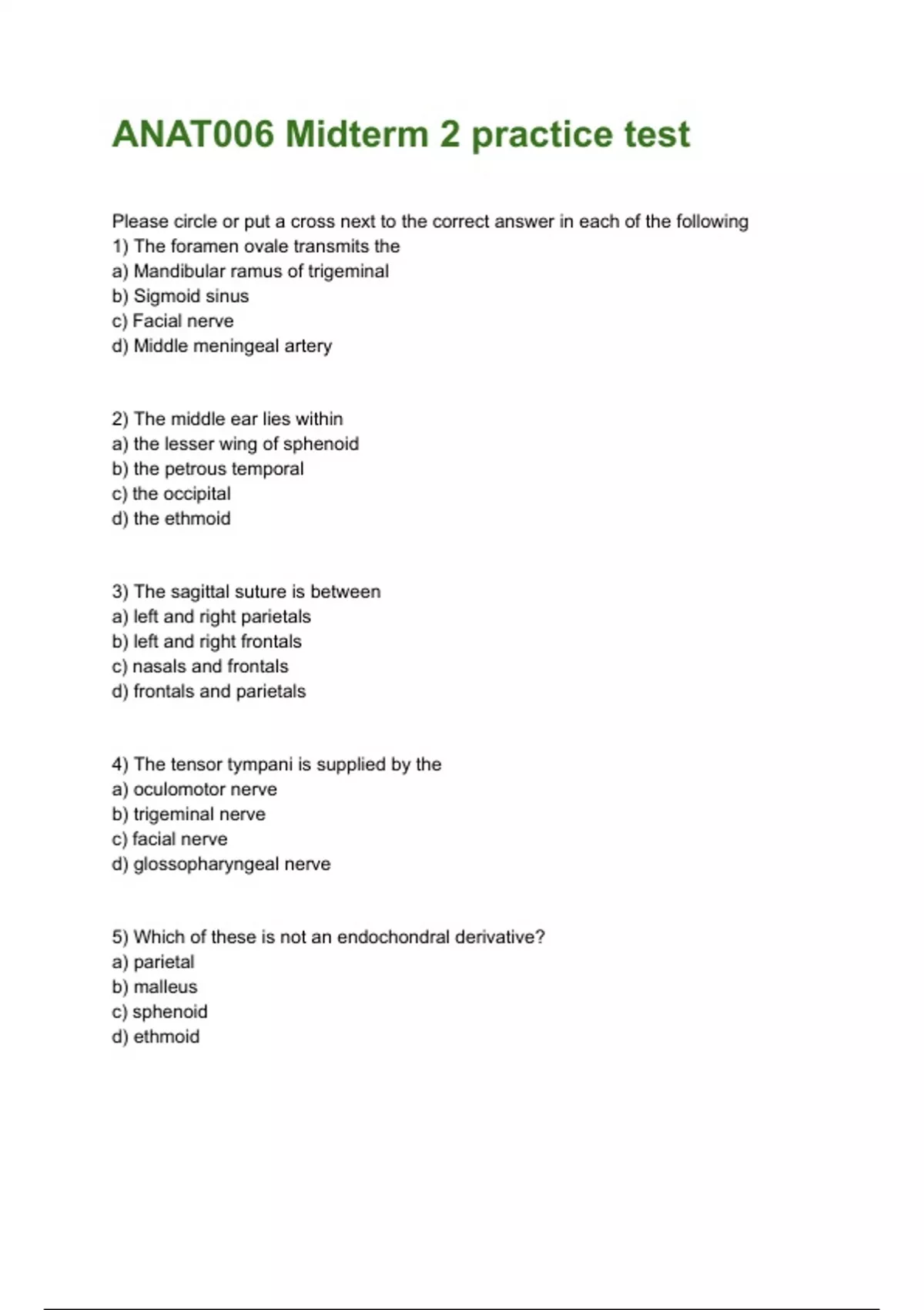 Please circle or put a cross next to the correct answer in each of the following 1) The foramen ovale transmits the a) Mandibular ramus of trigeminal b) Sigmoid sinus c) Facial nerve d) Middle meningeal artery 2) The middle ear lies within a) the lesser wing of sphenoid b) the petrous temporal c) the occipital d) the ethmoid