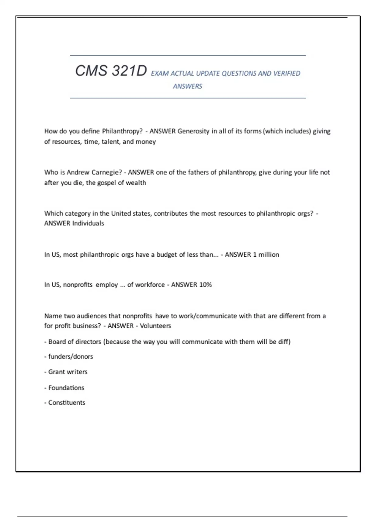 How do you define Philanthropy? - ANSWER Generosity in all of its forms (which includes) giving