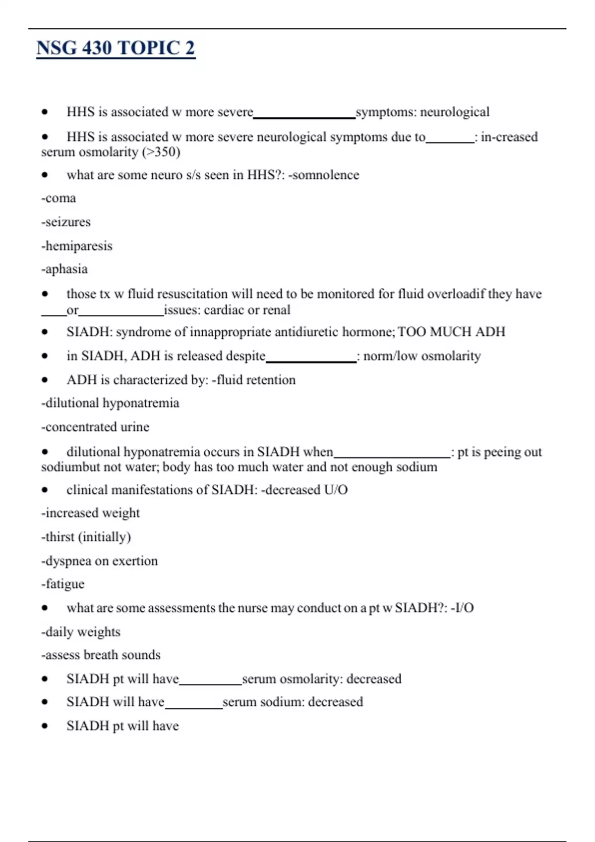 • SIADH pt will have serum osmolarity: decreased
