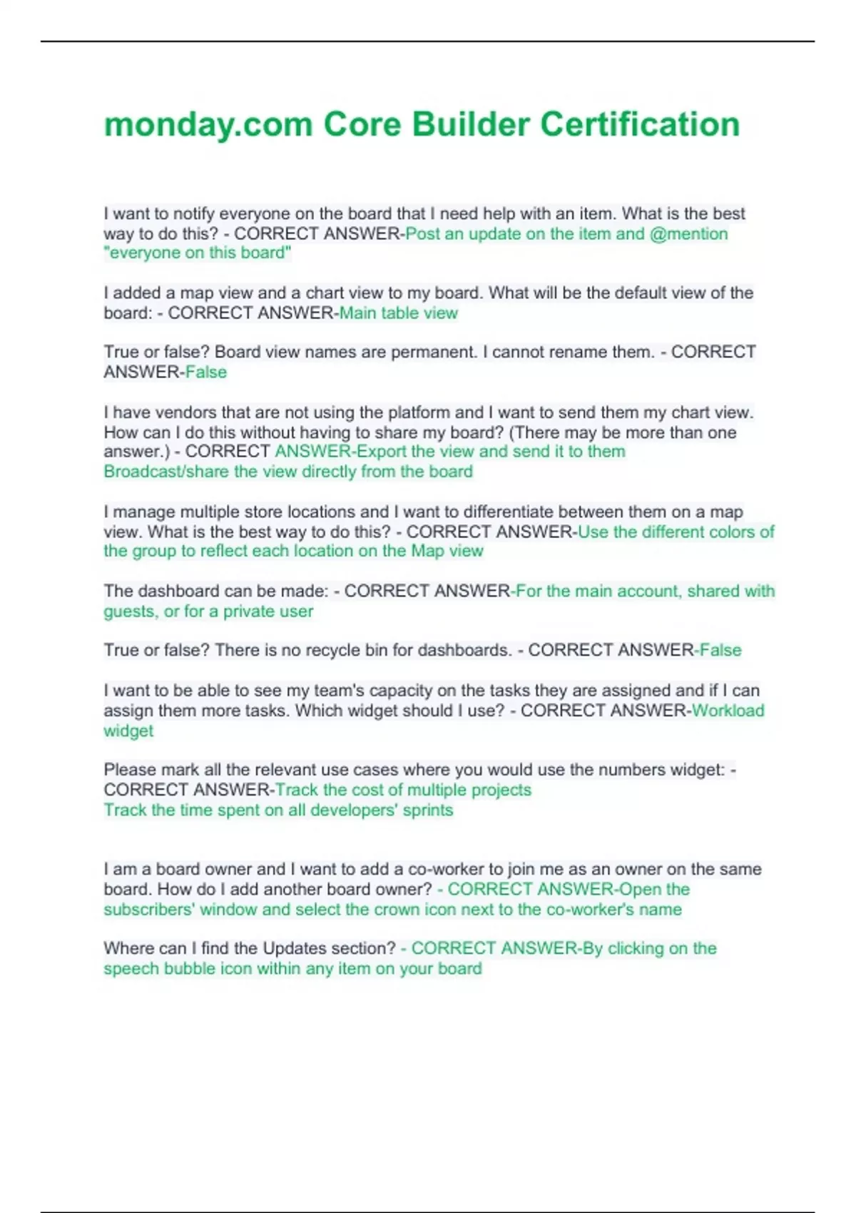 I want to notify everyone on the board that I need help with an item. What is the best way to do this? - CORRECT ANSWER-Post an update on the item and @mention "everyone on this board" I added a map view and a chart view to my board. What will be the default view of the board: - CORRECT ANSWER-Main table view True or false? Board view names are permanent. I cannot rename them. - CORRECT ANSWER-False I have vendors that are not using the platform and I want to send them my chart view. How can I do this without having to share my board? (There may be more than one answer.) - CORRECT ANSWER-Export the view and send it to them Broadcast/share the view directly from the board I manage multiple store locations and I want to differentiate between them on a map view. What is the best way to do this? - CORRECT ANSWER-Use the different colors of the group to reflect each location on the Map view The dashboard can be made: - CORRECT ANSWER-For the main account, shared with guests, or for a private user True or false? There is no recycle bin for dashboards. - CORRECT ANSWER-False I want to be able to see my team's capacity on the tasks they are assigned and if I can assign them more tasks. Which widget should I use? - CORRECT ANSWER-Workload widget