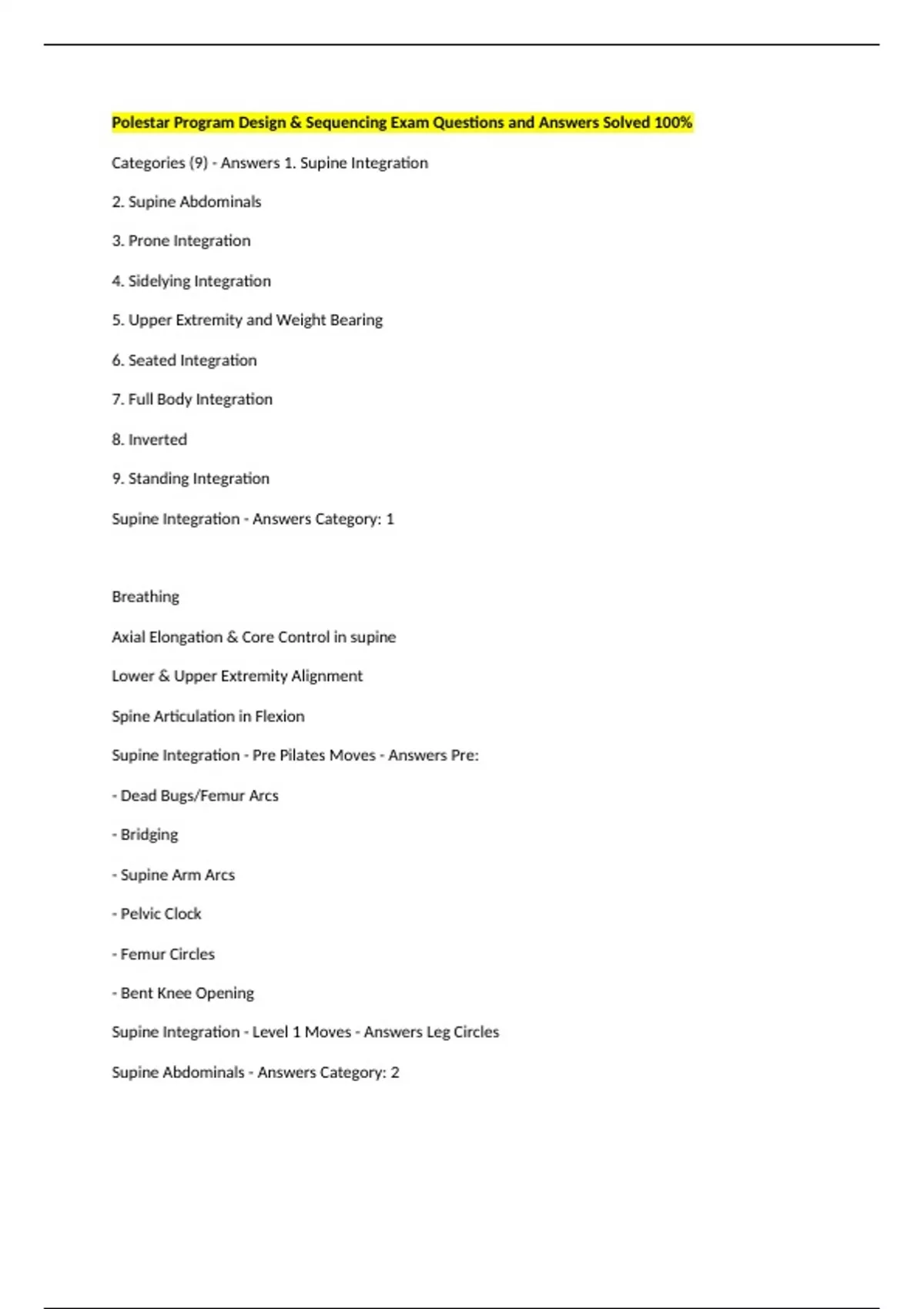 Polestar Program Design & Sequencing Exam Questions and Answers Solved 100% Categories (9) - Answers 1. Supine Integration 2. Supine Abdominals 3. Prone Integration 4. Sidelying Integration 5. Upper Extremity and Weight Bearing 6. Seated Integration 7. Full Body Integration 8. Inverted 9. Standing Integration Supine Integration - Answers Category: 1 Breathing Axial Elongation & Core Control in supine Lower & Upper Extremity Alignment Spine Articulation in Flexion Supine Integration - Pre Pilates Moves - Answers Pre: - Dead Bugs/Femur Arcs - Bridging - Supine Arm Arcs - Pelvic Clock - Femur Circles - Bent Knee Opening Supine Integration - Level 1 Moves - Answers Leg Circles Supine Abdominals - Answers Category: 2 Spine Flexion: Breathing Axial Elongation & Core Control Organization of HNS Supine Abdominals Pre Pilates Moves - Answers Chest Lift Assisted Roll Up Supine Abdominals Level 1 Moves - Answers Hundred Roll Up