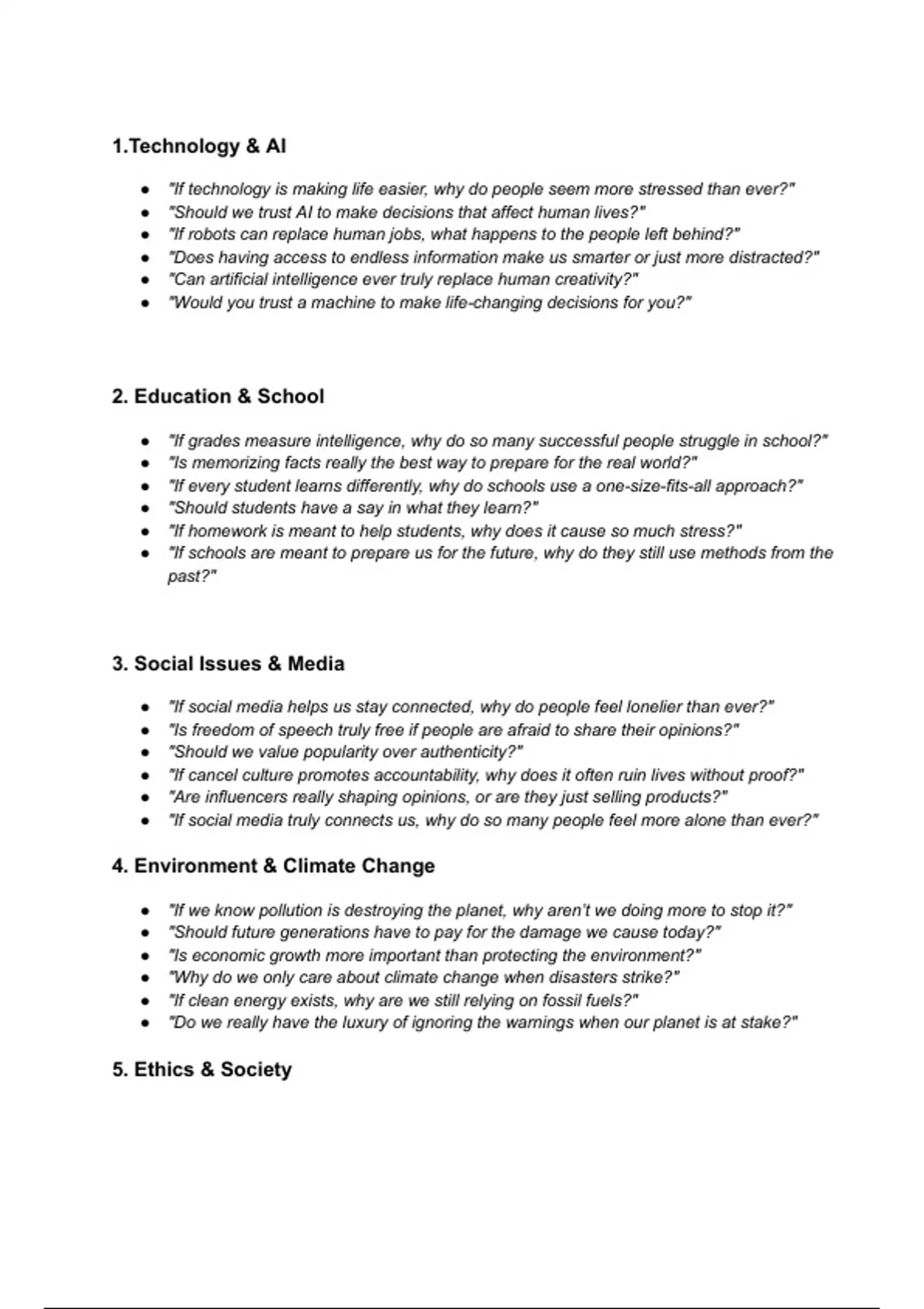 Sharpen your critical thinking and boost your essay and debate skills with this compelling collection of challenging questions across 14 key topics! This resource invites you to explore deep, thought-provoking questions that inspire analysis, argument-building, and reflection. Perfect for students, debaters, and writers, these questions cover vital themes including Technology & AI, Education, Social Issues, Environment, Ethics, Government, Science, Health, Justice, Sports, War, Gender Equality, Artificial Intelligence Ethics, and Art & Creativity. Why this helps: Sparks ideas for essay introductions, thesis statements, and body paragraphs Provides strong debate prompts to prepare your arguments and rebuttals Encourages you to think beyond surface-level answers and explore complexity Covers a broad range of relevant, real-world issues that resonate with academic topics Ideal for brainstorming, class discussions, and persuasive writing practice Use these questions to fuel your academic success by building thoughtful, well-supported arguments that impress teachers and judges alike.