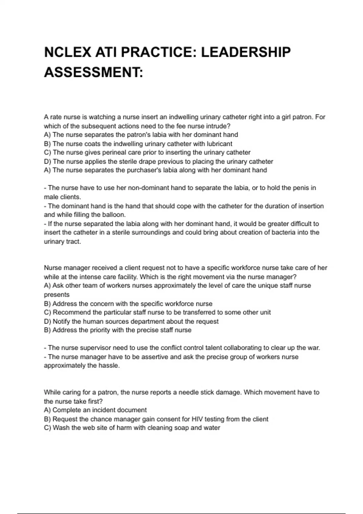 A rate nurse is watching a nurse insert an indwelling urinary catheter right into a girl patron. For