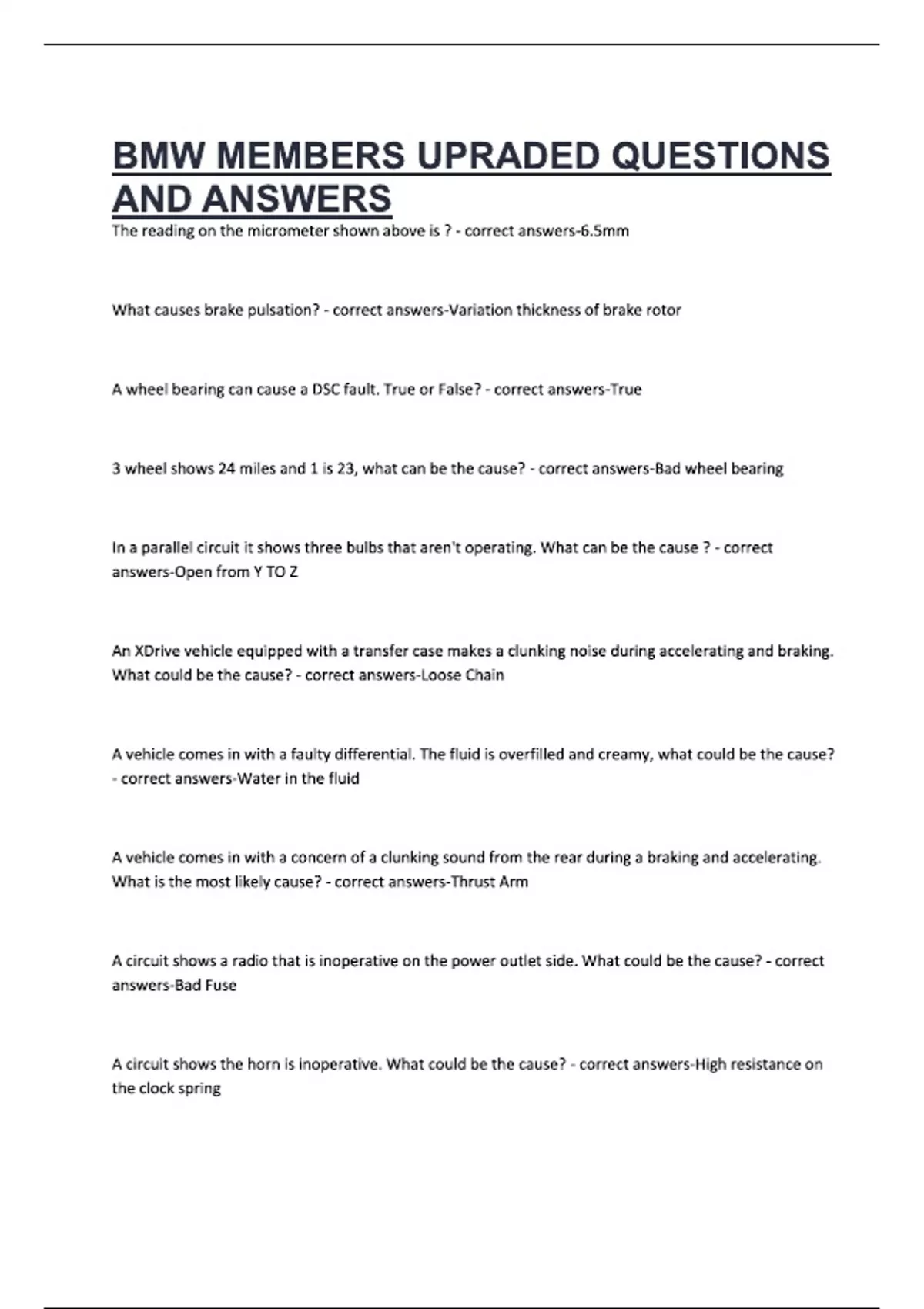 BMW MEMBERS UPRADED QUESTIONS AND ANSWERS The reading on the micrometer shown above is ? - correct answers-6.5mm What causes brake pulsation? - correct answers-Variation thickness of brake rotor A wheel bearing can cause a DSC fault. True or False? - correct answers-True 3 wheel shows 24 miles and 1 is 23, what can be the cause? - correct answers-Bad wheel bearing In a parallel circuit it shows three bulbs that aren't operating. What can be the cause ? - correct answers-Open from Y TO Z An XDrive vehicle equipped with a transfer case makes a clunking noise during accelerating and braking. What could be the cause? - correct answers-Loose Chain A vehicle comes in with a faulty differential. The fluid is overfilled and creamy, what could be the cause? - correct answers-Water in the fluid A vehicle comes in with a concern of a clunking sound from the rear during a braking and accelerating. What is the most likely cause? - correct answers-Thrust Arm A circuit shows a radio that is inoperative on the power outlet side. What could be the cause? - correct answers-Bad Fuse A circuit shows the horn is inoperative. What could be the cause? - correct answers-High resistance on the clock spring