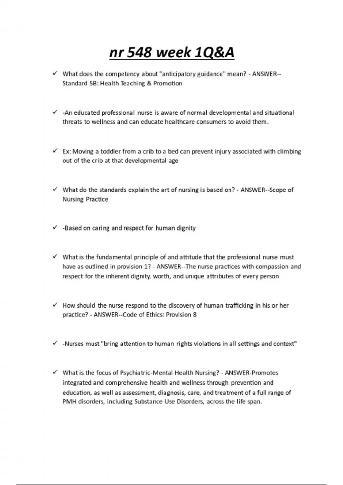 nr 548 week 1Q&A What does the competency about "anticipatory guidance" mean? - ANSWER--Standard 5B: Health Teaching & Promotion -An educated professional nurse is aware of normal developmental and situational threats to wellness and can educate healthcare consumers to avoid them. Ex: Moving a toddler from a crib to a bed can prevent injury associated with climbing out of the crib at that developmental age What do the standards explain the art of nursing is based on? - ANSWER--Scope of Nursing Practice -Based on caring and respect for human dignity What is the fundamental principle of and attitude that the professional nurse must have as outlined in provision 1? - ANSWER--The nurse practices with compassion and respect for the inherent dignity, worth, and unique attributes of every person How should the nurse respond to the discovery of human trafficking in his or her practice? - ANSWER--Code of Ethics: Provision 8 -Nurses must "bring attention to human rights violations in all settings and context" What is the focus of Psychiatric-Mental Health Nursing? - ANSWER-Promotes integrated and comprehensive health and wellness through prevention and education, as well as assessment, diagnosis, care, and treatment of a full range of PMH disorders, including Substance Use Disorders, across the life span...