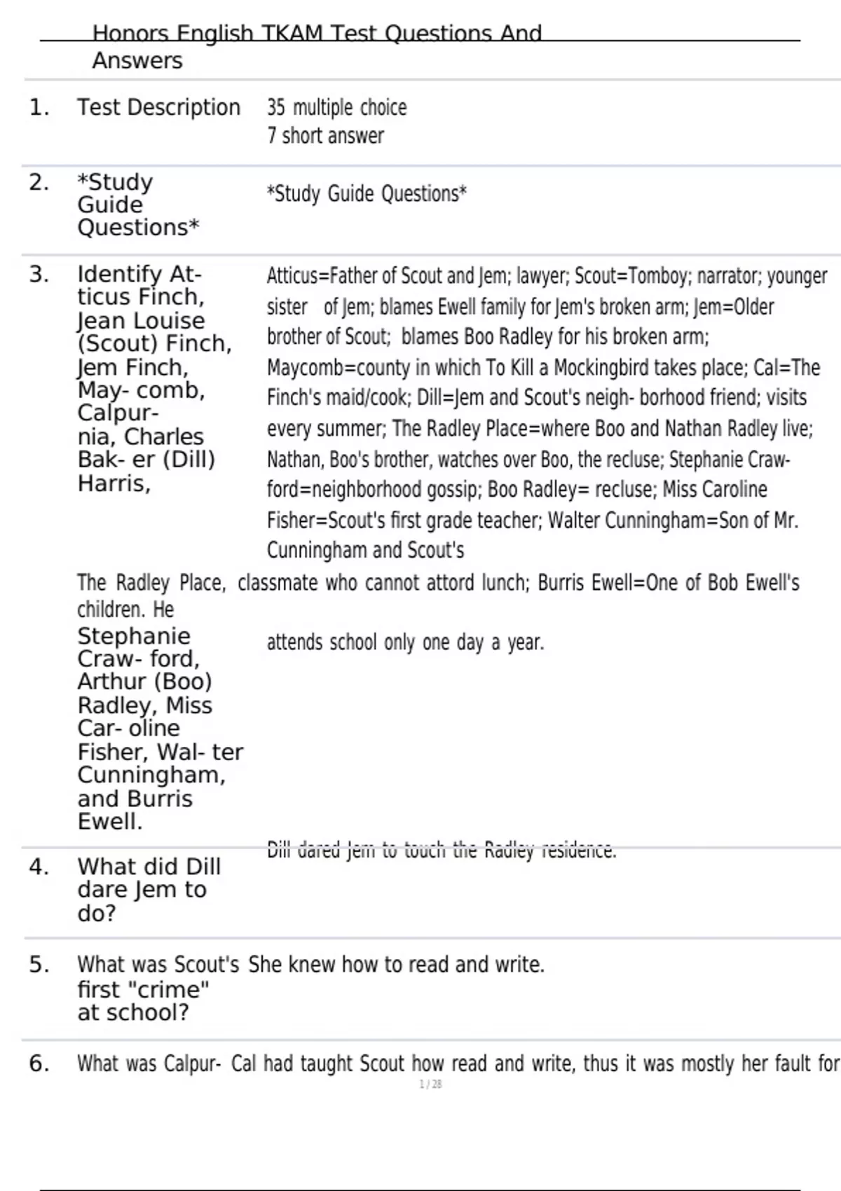 6. What was Calpur- Cal had taught Scout how read and write, thus it was mostly her fault for