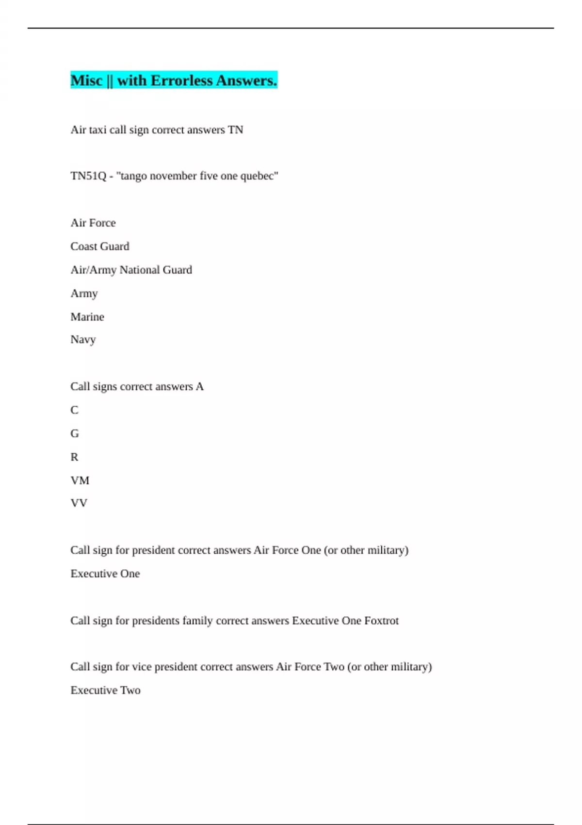Air taxi call sign correct answers TN TN51Q - "tango november five one quebec" Air Force Coast Guard Air/Army National Guard Army Marine Navy Call signs correct answers A C G R VM VV Call sign for president correct answers Air Force One (or other military) Executive One Call sign for presidents family correct answers Executive One Foxtrot Call sign for vice president correct answers Air Force Two (or other military) Executive Two