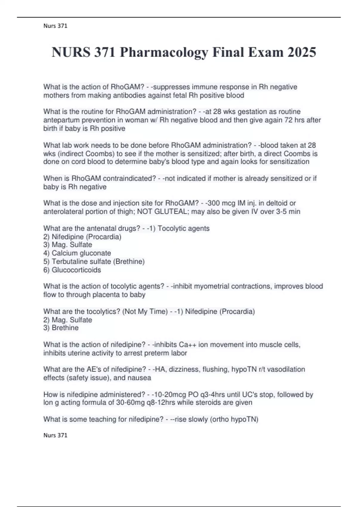 What is the action of RhoGAM? - -suppresses immune response in Rh negative mothers from making antibodies against fetal Rh positive blood What is the routine for RhoGAM administration? - -at 28 wks gestation as routine antepartum prevention in woman w/ Rh negative blood and then give again 72 hrs after birth if baby is Rh positive What lab work needs to be done before RhoGAM administration? - -blood taken at 28 wks (indirect Coombs) to see if the mother is sensitized; after birth, a direct Coombs is done on cord blood to determine baby's blood type and again looks for sensitization When is RhoGAM contraindicated? - -not indicated if mother is already sensitized or if baby is Rh negative What is the dose and injection site for RhoGAM? - -300 mcg IM inj. in deltoid or anterolateral portion of thigh; NOT GLUTEAL; may also be given IV over 3-5 min What are the antenatal drugs? - -1) Tocolytic agents 2) Nifedipine (Procardia) 3) Mag. Sulfate 4) Calcium gluconate 5) Terbutaline sulfate (Brethine) 6) Glucocorticoids What is the action of tocolytic agents? - -inhibit myometrial contractions, improves blood flow to through placenta to baby What are the tocolytics? (Not My Time) - -1) Nifedipine (Procardia) 2) Mag. Sulfate 3) Brethine What is the action of nifedipine? - -inhibits Ca++ ion movement into muscle cells, inhibits uterine activity to arrest preterm labor What are the AE's of nifedipine? - -HA, dizziness, flushing, hypoTN r/t vasodilation effects (safety issue), and nausea How is nifedipine administered? - -10-20mcg PO q3-4hrs until UC's stop, followed by lon g acting formula of 30-60mg q8-12hrs while steroids are given What is some teaching for nifedipine? - --rise slowly (ortho hypoTN) Nurs 371 Nurs 371 -avoid grapefruit (interferes w/ effect) -do not use with mag. sulfate or terbutaline Why is MAGNESIUM SULFATE given to pregnant women? - -To PREVENT SEIZURES (CNS depressant) induced by hypertension (preeclampsia) and to decrease frequency and intensity of UC's by relaxing the smooth muscle of uterus What is the dosage? - -loading dose is 4-6g over 20-30 min and the maintenance dose is 1-4 g/hr; given as IVPB When is mag sulfate contraindicated? - -in myasthenia gravis pts and in renal failure pts (so monitor urine output b/c it is excreted by the kidneys) What should we monitor the newborn for whose mother was given mag. sulfate? - lethargy, hypotonia, respiratory depression What to monitor/assess in a pt receiving mag. sulfate? - -BP, respiration, O2 sat., loss of or diminished DTR's (first sign of toxicity), urine output, LOC, serum magnesium level What are the maternal AE's r/t mag. sulfate (not concerned)? - -hot flashes (fan or cold compresses), n/v, blurred vision, dry mouth, lethargy, drowsiness, that usually appear at loading does and go away afterwards What do FHT's look like in a baby whose mother is receiving mag. sulfate? - -decreased variability, deceleration, no accelerations What are intolerable AE's of mag sulfate for mother (concerned) Hint: BURP? - -stop infusion if mother has urine output <100ml over 4 hrs, RR <12bpm, total loss of reflexes, BP decrease, altered mental status, muscle weakness, serum mag level >8/9 What is calcium gluconate? - -the antidote for magnesium toxicity, given slowly b/c of cardiac changes, always have at bedside How is calcium gluconate administered? - -10mL of 10% calcium gluconate (1g) given IVP over 3-5 min What class of medication is terbutaline sulfate (Brethine)? - -beta-adrenergic agonist (beta mimetic) What is the action of terbutaline sulfate? - -given as SQ inj, stimulates B2 adrenergic receptors to relax bronchial smooth muscle and to relax uterine muscle, blocking UC's What are some safety concerns with terbutaline? - -hold if HR is 120 or greater, not given to women w/ hx of cardiac disease Nurs 371 Nurs 371 What are some maternal AE's of terbutaline and what will the fetal heart rate look like? - -maternal AE's include palpitations, termors, nervousness, flushing; FHR will be tachycardic What is the purpose of the glucocorticoid meds (dexamethasone and betamethasone)? - -stimulates fetal lung maturity and surfactant production and decreases RDS in situations of PTL/PTD (FYI: lungs are the last thing to develop in babies) How is the glucocorticoid meds given? - -given as DEEP IM inj. (local muscle atrophy), multiple doses, birth should be delayed for 24 hrs after completion of treatment (so 48 hrs total tx) What are the doses for eas glucocorticoid? - --betamethisone: 12mg IM x 2 doses w/ 24 hrs b/t doses -dexamethasone: 6mg IM x 4 doses w/ 12 hrs b/t doses What are the intrapartal drugs? - -1) cervical ripening agents (prostaglandins) 2) pitocin 3) pain relief drugs 4) methergine 5) rubella virus vaccine Describe prostaglandins. - -consists of dinoprostone (Cervidil), dinoprostone gel (Prepidil), and misoprostol (Cytotec); they are used to induce labor by cervical ripening and start contractions, misoprostol also used to stop maternal hemorrhage What is Pitocin and its action/purpose? - -it is a synthetic form of oxytocin (which is produced by the pituitary gland) and it stimulates smooth muscle contractions of the uterus used for augmentation and induction of labor, also used to control PP hemorrhage What are some AE's of pitocin for mother and baby? - -UTERINE TACHYSYTOLE, placental abruption, uterine rupture, fetal hypoxia r/t decreased uterine bloodflow, abnormal FHR, water intoxication r/t anti-diuretic effects, HR/BP fluctuations, arrhythmias, uterine ejection What are the nursing considerations for Pitocin? - -HIGH ALERT MED, monitor fetal tracings q15min w/ every change in dose during first stage of labor, and then q5min during second stage of labor, monitor maternal vitals q30-60min and with every dose change, assess I&O (urine output should be 120mL or more q4h) How is Pitocin given and at what dose? - -given IV, ordered in mU/min, often mixed as 10units/1000mL or 20units/1000mL, connect line to proximal port, begin