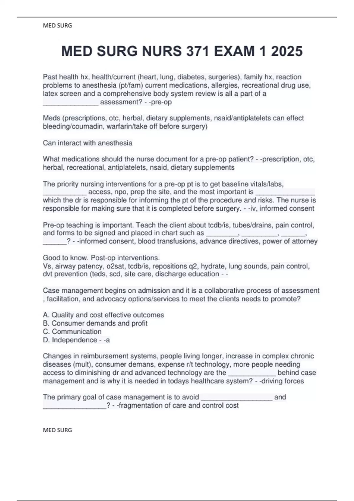 Past health hx, health/current (heart, lung, diabetes, surgeries), family hx, reaction problems to anesthesia (pt/fam) current medications, allergies, recreational drug use, latex screen and a comprehensive body system review is all a part of a ______________ assessment? - -pre-op Meds (prescriptions, otc, herbal, dietary supplements, nsaid/antiplatelets can effect bleeding/coumadin, warfarin/take off before surgery) Can interact with anesthesia What medications should the nurse document for a pre-op patient? - -prescription, otc, herbal, recreational, antiplatelets, nsaid, dietary supplements The priority nursing interventions for a pre-op pt is to get baseline vitals/labs, ___________ access, npo, prep the site, and the most important is _______________ which the dr is responsible for informing the pt of the procedure and risks. The nurse is responsible for making sure that it is completed before surgery. - -iv, informed consent Pre-op teaching is important. Teach the client about tcdb/is, tubes/drains, pain control, and forms to be signed and placed in chart such as ________, _________, ______, ______? - -informed consent, blood transfusions, advance directives, power of attorney Good to know. Post-op interventions. Vs, airway patency, o2sat, tcdb/is, repositions q2, hydrate, lung sounds, pain control, dvt prevention (teds, scd, site care, discharge education - - Case management begins on admission and it is a collaborative process of assessment , facilitation, and advocacy options/services to meet the clients needs to promote? A. Quality and cost effective outcomes B. Consumer demands and profit C. Communication D. Independence - -a Changes in reimbursement systems, people living longer, increase in complex chronic diseases (mult), consumer demans, expense r/t technology, more people needing access to diminishing dr and advanced technology are the ____________ behind case management and is why it is needed in todays healthcare system? - -driving forces The primary goal of case management is to avoid __________________ and ________________? - -fragmentation of care and control cost MED SURG MED SURG True of false, case management begins at admission and end at discharge? - -true Which of the following is the nurses role in case management? A. Admission, transfer, discharge, post discharge orders B. Initiation, revision, evaluation of plan of care C. Report clients status to team D. Coordinate discharge plan, facilitate referrals and utilization of community resources - -a, b, c, d Good to know different types of insurance providers Medicare (elderly), medicaid (low income), kchip (for kids), tri-care (military insurance), individual, employer - - What are the four causative agents of infections? - -1. Bacterial (, staph) 2. Viral (hiv, herpes) 3. Fungal (candida, aspergillus) 4. Protozoa/parasites (malaria) Match the following to it correct term. (droplet, contact, airborne, vector borne) A. __________ animals or insects as intermediaries (malaria, lymes disease, rocky mountain spotted fever) B. ___________ sneezing, coughing, talkinging (flu, pertussis, steptococcalpneumonia ) C. ____________direct physical contact or indirect contact with an inanimate object (c diff, herpes simplex virus, impetigo) D. ____________ sneezing, coughing (measles, varicella, tb) - -a. Vector borne B. Droplet C. Contact D. Airborne Which of the following pre-dispose someone to develop an infection? A. Medication therapy, immunocompromised, glucocosteriod, chemo B. Chronic diseases (diabetes, renal/hepatic, lung,resp) C. Environmental D. Health care worker - -a, b, c Which of the following are reasons to avoid immunizations (red flag)? A. Bad reaction/allergies to eggs B. Women ages 30-40 C. Pregnant/lactating D. Fever within 24 hrs MED SURG MED SURG E. Immunocompromised F. Age 65-75 - -a, c, d, e General s/s of an infection include which of the following? A. Fever, chills, increase wbc B. Loss of consciousness, pallor, decrease in bp C. Fever, chills, decrease in wbc D. Hyperemia, inflammation - -a Which of the following would a nurse typically see change with an infection affecting the brain? A. Nausea, vomiting, anorexia B. Nuchal rigidity (painful stiff neck) C.photophobia D. Sob, change loc E. Heachach, change in loc - -b,c, e The purpose for performing a wbc with differential is that it provides information about the ________________________ . The normal wbc level is __________ to ___________. Can be slightly lower in the elderly. If its decreased (leukopenia below 4,300) may be an immune problem/immunocompromised. - -type of infection. 5,0000-10,000 If neutrophils are elevated, it is a sign that the infection is _________ related. If lymphocytes are elevated, it is a sign that the infection is _________ related. If eosinophils are elevated, it is a sign that the infection is __________ related. - bacterial Viral Parasite/allergen A ____________________ is done to determine what pathogen is growing and what effect antimicrobials have on the microorganism (what meds you can treat it with). - c&s Which of the following are ways to collect a specimen to run a c&s? A. Urine B. Sputum C. Semen D. Blood E. Wound drainage F. Abscess fluids G.sweat H. Peritoneal fluid I. Tears - -a, b, d, e, f, h MED SURG MED SURG The sensitization portion of the c&s can take up to ___________ hours. In the meantime, pt will be treated with an antibiotic based on the hospitals ___________. The final report is to be given to the pcp whom will make decisions based on the results and what to use to treat the infection if its no sensitive. - -48-72hrs Antibiogram An esr is the rate at which settle out of plasma. Normal for adults is _____to_______mm/hr. If this is increased, it can indicate an active ____________. - 15to20mm/hr Inflammation/infection The main difference between an antibody screening test and an antibody test is? A. An antibody screen detects the presence of of antibodies against specific against. Has been expose