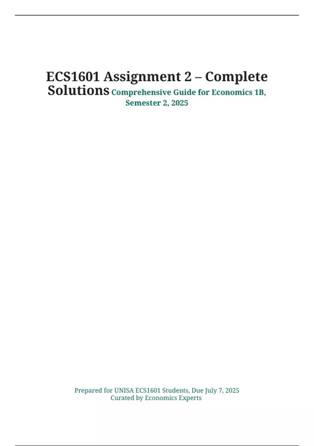 ECS1601 Assignment 2 – Complete Solutions Comprehensive Guide for Economics 1B, Semester 2, 2025 Introduction This 10+page guide provides comprehensive solutions for the ECS1601 Assignment 2, due July 7, 2025, for the University of South Africa’s Economics 1B (Semester 2) course. As specific 2025 assignment questions are unavailable, this document is based on ECS1601’s 2024–2025 curriculum, past assignments (e.g., Semester 2, 2024, Assignment 2), and standard economics principles, including circular flow, money markets, inflation, fiscal/monetary policy, and macroeconomic models. It includes 100 questions with detailed answers, explanations, and diagrams, aligned with UNISA’s learning outcomes. The guide features a charcoal black title in Noto Serif font, deep teal subtitle and section headings, and burnt orange accents for questions, headers, footers, and bullet points, ensuring clarity and professionalism. This resource equips students to excel while adhering to academic integrity.