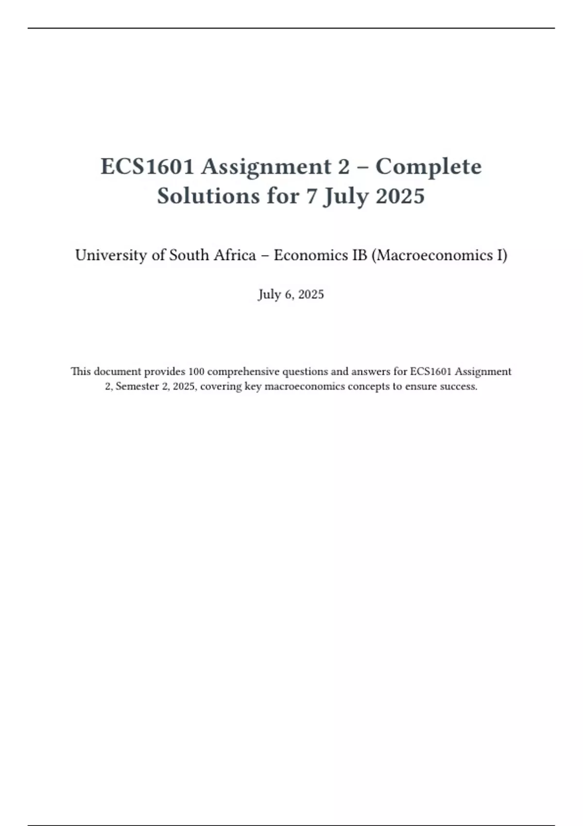 ECS1601 Assignment 2 – Complete Solutions for 7 July 2025 University of South Africa – Economics IB (Macroeconomics I) July 6, 2025 Introduction to ECS1601 Assignment 2 ECS1601 (Economics IB) at the University of South Africa focuses on macroeconomics, covering topics such as the circular flow of income, national income accounting, money markets, inflation, unemployment, and fiscal/monetary policy. Assignment 2, due on July 7, 2025, typically includes written and calculation-based questions, as seen in prior semesters (e.g., 2024 Assignment 2, due July 30, 2024). This document provides 100 exam-style questions and answers, drawing from Quizlet, Studocu, and StudyPass resources, to prepare students for the assignment. The questions span foundational concepts, practical applications, and advanced scenarios, ensuring comprehensive coverage for a distinction-level performance.