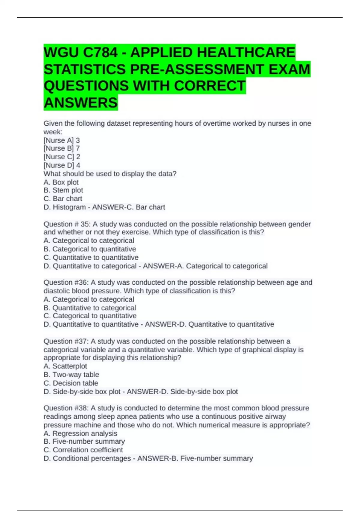 WGU C784 - APPLIED HEALTHCARE STATISTICS PRE-ASSESSMENT EXAM QUESTIONS WITH CORRECT ANSWERS Given the following dataset representing hours of overtime worked by nurses in one week: [Nurse A] 3 [Nurse B] 7 [Nurse C] 2 [Nurse D] 4 What should be used to display the data? A. Box plot B. Stem plot C. Bar chart D. Histogram - ANSWER-C. Bar chart Question # 35: A study was conducted on the possible relationship between gender and whether or not they exercise. Which type of classification is this? A. Categorical to categorical B. Categorical to quantitative C. Quantitative to quantitative D. Quantitative to categorical - ANSWER-A. Categorical to categorical Question #36: A study was conducted on the possible relationship between age and diastolic blood pressure. Which type of classification is this? A. Categorical to categorical B. Quantitative to categorical C. Categorical to quantitative D. Quantitative to quantitative - ANSWER-D. Quantitative to quantitative Question #37: A study was conducted on the possible relationship between a categorical variable and a quantitative variable. Which type of graphical display is appropriate for displaying this relationship? A. Scatterplot B. Two-way table C. Decision table D. Side-by-side box plot - ANSWER-D. Side-by-side box plot Question #38: A study is conducted to determine the most common blood pressure readings among sleep apnea patients who use a continuous positive airway pressure machine and those who do not. Which numerical measure is appropriate? A. Regression analysis B. Five-number summary C. Correlation coefficient D. Conditional percentages - ANSWER-B. Five-num