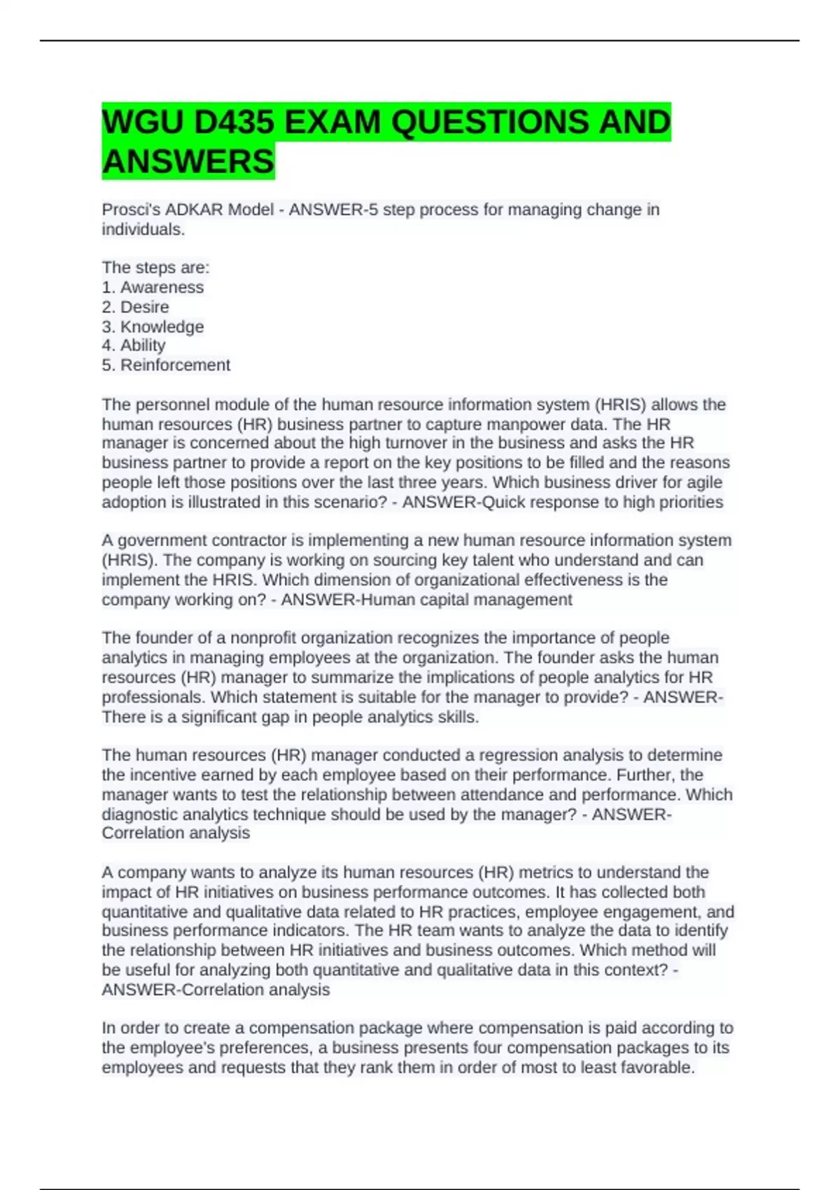 WGU D435 EXAM QUESTIONS AND ANSWERS Prosci's ADKAR Model - ANSWER-5 step process for managing change in individuals. The steps are: 1. Awareness 2. Desire 3. Knowledge 4. Ability 5. Reinforcement The personnel module of the human resource information system (HRIS) allows the human resources (HR) business partner to capture manpower data. The HR manager is concerned about the high turnover in the business and asks the HR business partner to provide a report on the key positions to be filled and the reasons people left those positions over the last three years. Which business driver for agile adoption is illustrated in this scenario? - ANSWER-Quick response to high priorities A government contractor is implementing a new human resource information system (HRIS). The company is working on sourcing key talent who understand and can implement the HRIS. Which dimension of organizational effectiveness is the company working on? - ANSWER-Human capital management The founder of a nonprofit organization recognizes the importance of people analytics in managing employees at the organization. The founder asks the human resources (HR) manager to summarize the implications of people analytics for HR professionals. Which statement is suitable for the manager to provide? - ANSWER-There is a significant gap in people analytics skills. The human resources (HR) manager conducted a regression analysis to determine the incentive earned by each employee based on their performance. Further, the manager wants to test the relationship between attendance and performance. Which diagnostic analytics technique should be used by the manager? - ANSWER-Correlation analysis A company wants to analyze its human resources (HR) metrics to understand the impact of HR initiatives on business performance outcomes. It has collected both quantitative and qualitative data related to HR practices, empl