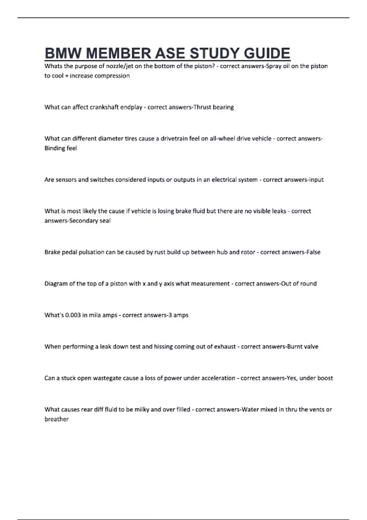 BMW MEMBER ASE STUDY GUIDE Whats the purpose of nozzle/jet on the bottom of the piston? - correct answers-Spray oil on the piston to cool + increase compression What can affect crankshaft endplay - correct answers-Thrust bearing What can different diameter tires cause a drivetrain feel on all-wheel drive vehicle - correct answers-Binding feel Are sensors and switches considered inputs or outputs in an electrical system - correct answers-input What is most likely the cause if vehicle is losing brake fluid but there are no visible leaks - correct answers-Secondary seal Brake pedal pulsation can be caused by rust build up between hub and rotor - correct answers-False Diagram of the top of a piston with x and y axis what measurement - correct answers-Out of round What's 0.003 in mila amps - correct answers-3 amps When performing a leak down test and hissing coming out of exhaust - correct answers-Burnt valve Can a stuck open wastegate cause a loss of power under acceleration - correct answers-Yes, under boost What causes rear diff fluid to be milky and over filled - correct answers-Water mixed in thru the vents or breather