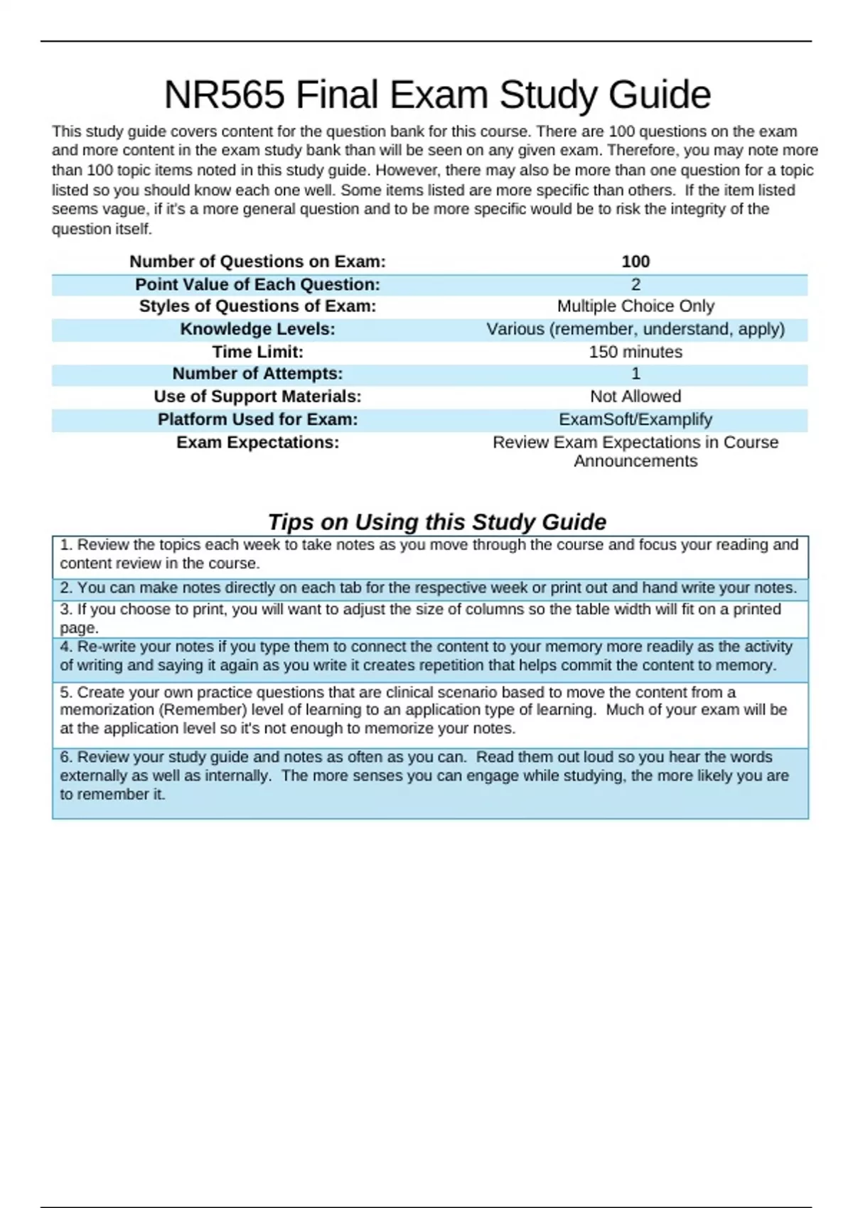 memorization (Remember) level of learning to an application type of learning. Much of your exam will be