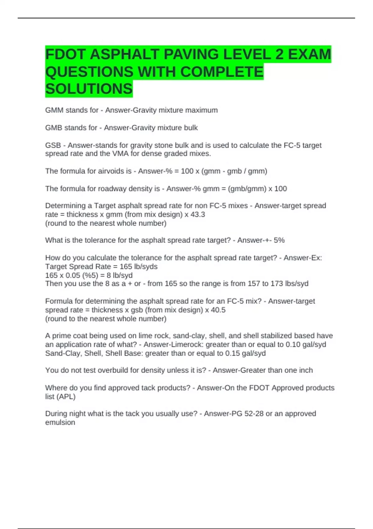 FDOT ASPHALT PAVING LEVEL 2 EXAM QUESTIONS WITH COMPLETE SOLUTIONS