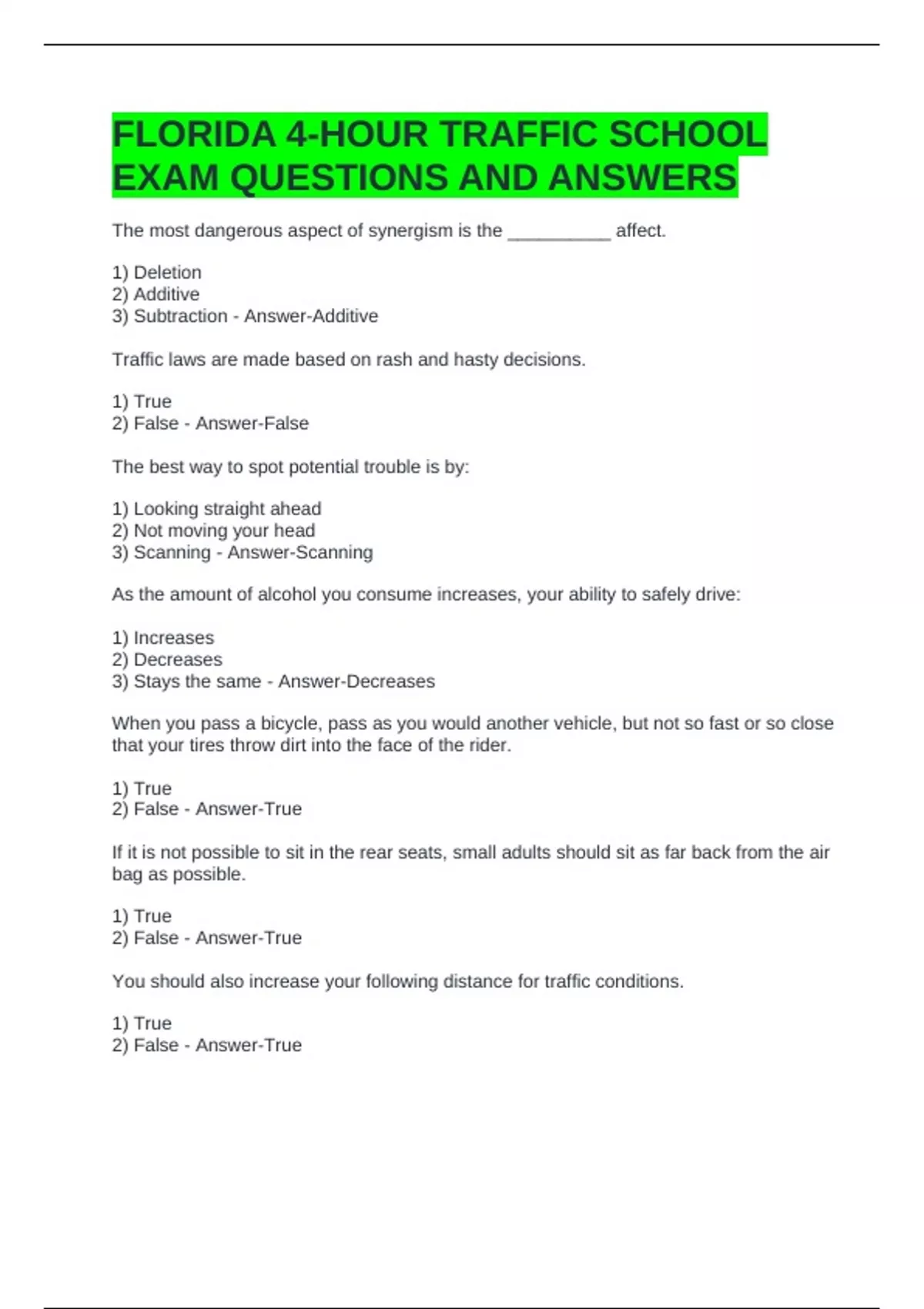 FLORIDA 4-HOUR TRAFFIC SCHOOL EXAM QUESTIONS AND ANSWERS