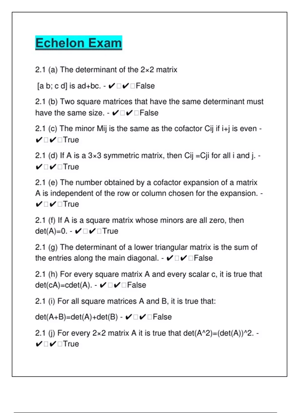 2.3 (a) If A is a 3×3 matrix, then det(2A)=2det(A). - ✔ ✔ False