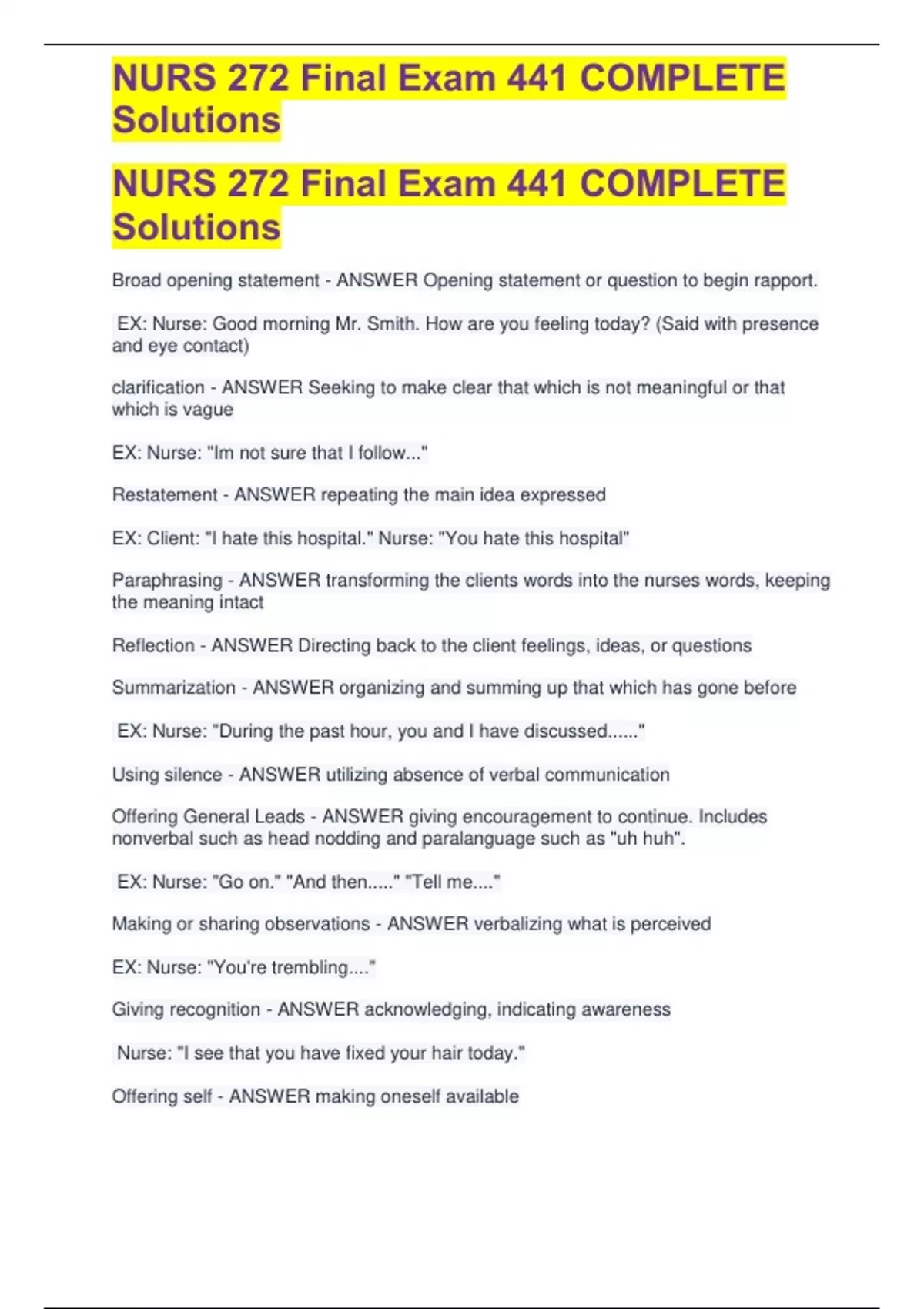 NURS 272 Final Exam 441 COMPLETE Solutions