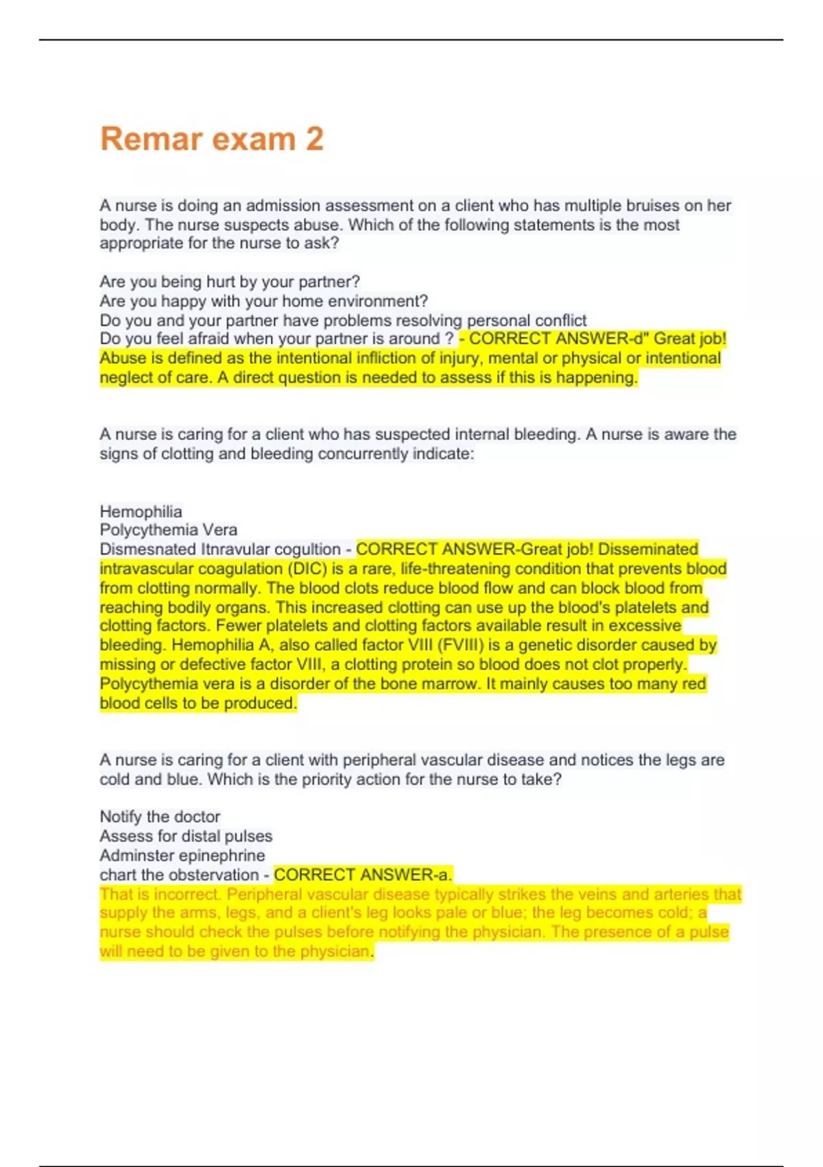 A nurse is doing an admission assessment on a client who has multiple bruises on her body. The nurse suspects abuse. Which of the following statements is the most appropriate for the nurse to ask? Are you being hurt by your partner? Are you happy with your home environment? Do you and your partner have problems resolving personal conflict Do you feel afraid when your partner is around ? - CORRECT ANSWER-d" Great job! Abuse is defined as the intentional infliction of injury, mental or physical or intentional neglect of care. A direct question is needed to assess if this is happening.