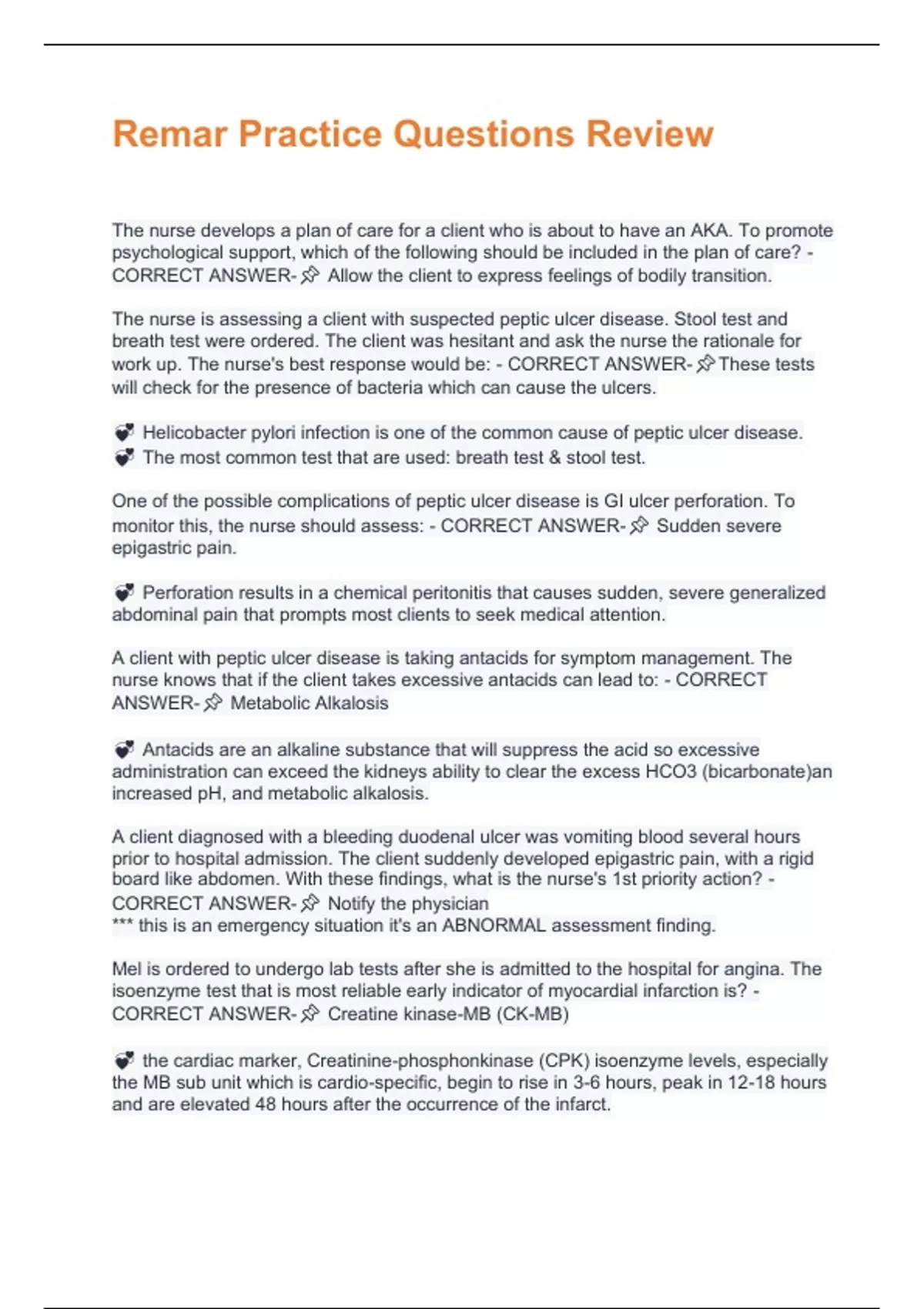 The nurse develops a plan of care for a client who is about to have an AKA. To promote psychological support, which of the following should be included in the plan of care? - CORRECT ANSWER- Allow the client to express feelings of bodily transition. The nurse is assessing a client with suspected peptic ulcer disease. Stool test and breath test were ordered. The client was hesitant and ask the nurse the rationale for work up. The nurse's best response would be: - CORRECT ANSWER-These tests will check for the presence of bacteria which can cause the ulcers. Helicobacter pylori infection is one of the common cause of peptic ulcer disease. The most common test that are used: breath test & stool test. One of the possible complications of peptic ulcer disease is GI ulcer perforation. To monitor this, the nurse should assess: - CORRECT ANSWER- Sudden severe epigastric pain. Perforation results in a chemical peritonitis that causes sudden, severe generalized abdominal pain that prompts most clients to seek medical attention. A client with peptic ulcer disease is taking antacids for symptom management. The nurse knows that if the client takes excessive antacids can lead to: - CORRECT ANSWER- Metabolic Alkalosis Antacids are an alkaline substance that will suppress the acid so excessive administration can exceed the kidneys ability to clear the excess HCO3 (bicarbonate)an increased pH, and metabolic alkalosis. A client diagnosed with a bleeding duodenal ulcer was vomiting blood several hours prior to hospital admission. The client suddenly developed epigastric pain, with a rigid board like abdomen. With these findings, what is the nurse's 1st priority action? - CORRECT ANSWER- Notify the physician *** this is an emergency situation it's an ABNORMAL assessment finding