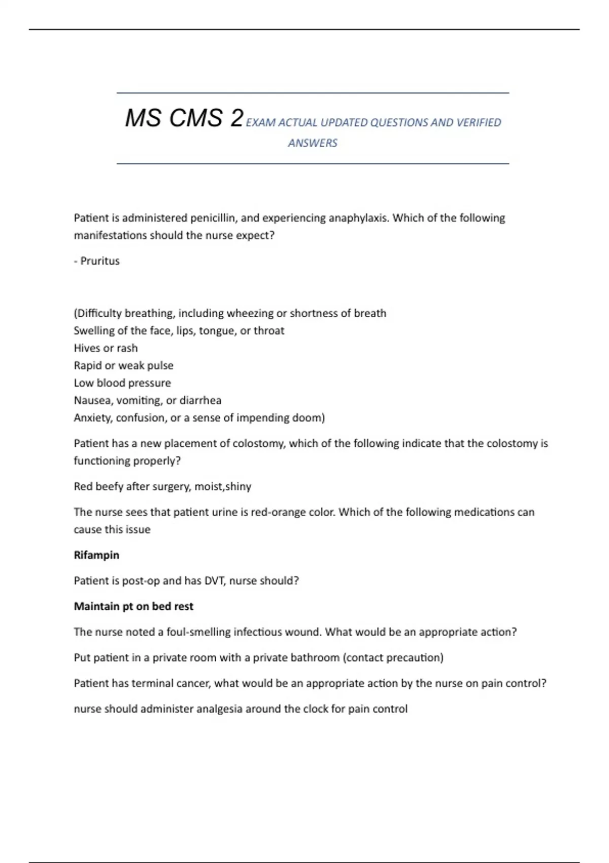 MS CMS 2 EXAM ACTUAL UPDATED QUESTIONS AND VERIFIED
