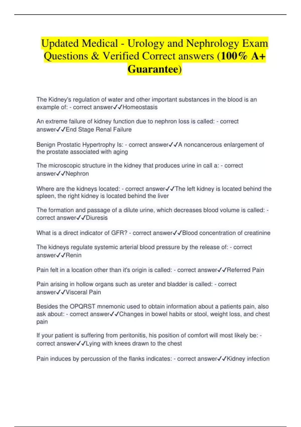 Updated Medical - Urology and Nephrology Exam Questions & Verified Correct answers (100% A+ Guarantee) The Kidney's regulation of water and other important substances in the blood is an example of: - correct answerHomeostasis An extreme failure of kidney function due to nephron loss is called: - correct answerEnd Stage Renal Failure Benign Prostatic Hypertrophy Is: - correct answerA noncancerous enlargement of the prostate associated with aging The microscopic structure in the kidney that produces urine in call a: - correct answerNephron