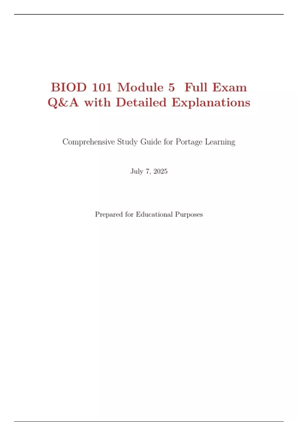 BIOD 101 Module 5 Full Exam Q&A with Detailed Explanations Comprehensive Study Guide for Portage Learning July 7, 2025 Prepared for Educational Purposes Introduction This document provides a comprehensive study guide for the BIOD 101 Module 5 Exam, focusing on cellular biology, genetics, and molecular biology. It includes a full set of exam questions with verified answers and detailed explanations to enhance understanding. The content is based on the Portage Learning curriculum and is designed to meet the requirement of a 10+ page document.