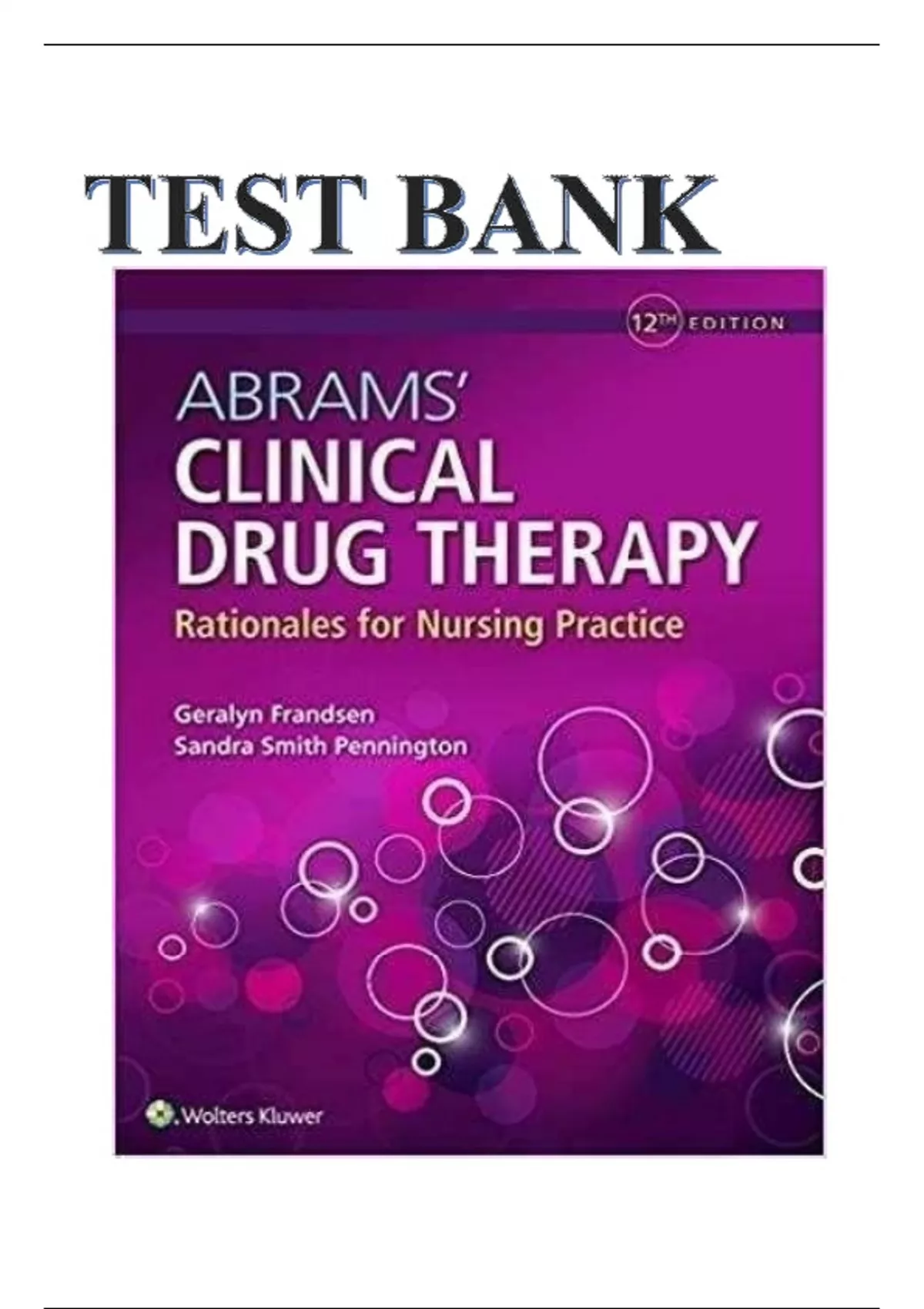 This document features a complete test bank for the 12th edition of Abrams’ Clinical Drug Therapy by Geralyn Frandsen. It includes NCLEX-style questions with rationales, covering pharmacologic principles, drug classifications, safe medication administration, and clinical decision-making. Tailored for nursing students aiming to reinforce pharmacology knowledge and prepare for exams.