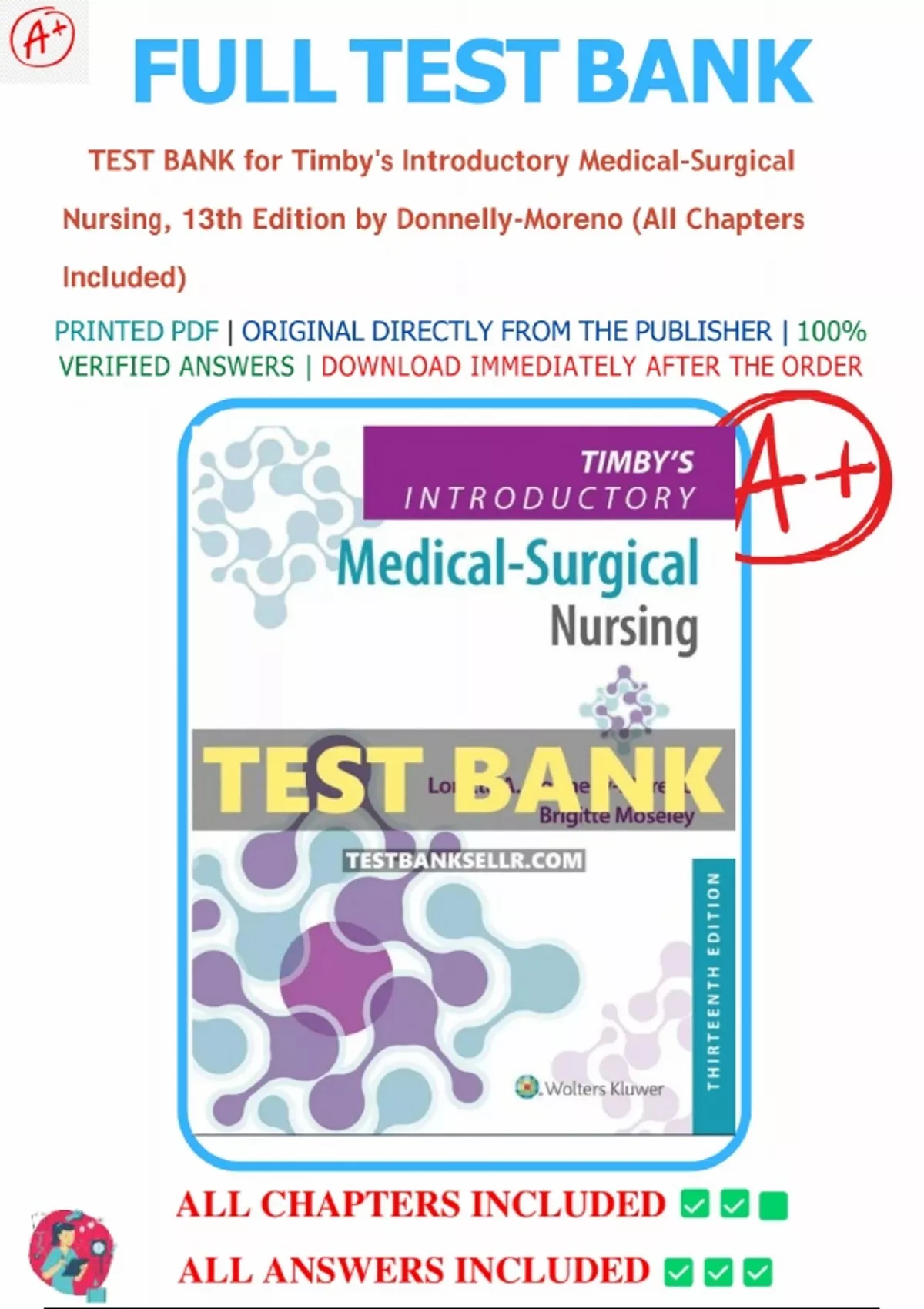 Test bank for Timby's Introductory Medical-Surgical Nursing, 13th Edition by Donnelly-Moreno, All Chapters 1-72, Complete. Complete test guide.