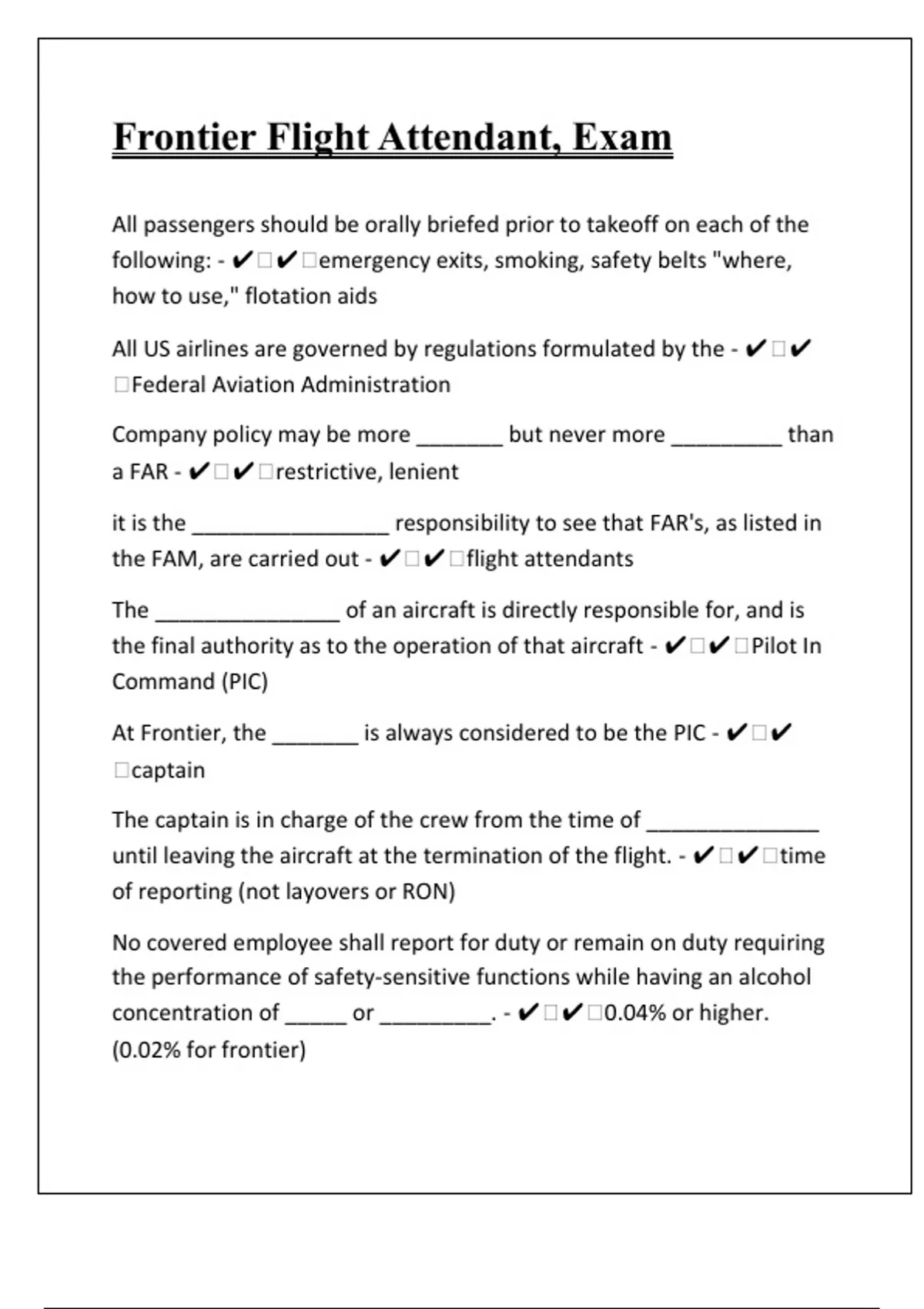 All passengers should be orally briefed prior to takeoff on each of the following: - emergency exits, smoking, safety belts "where, how to use," flotation aids All US airlines are governed by regulations formulated by the - Federal Aviation Administration Company policy may be more _______ but never more _________ than a FAR - restrictive, lenient it is the ________________ responsibility to see that FAR's, as listed in the FAM, are carried out - flight attendants The _______________ of an aircraft is directly responsible for, and is the final authority as to the operation of that aircraft - Pilot In Command (PIC) At Frontier, the _______ is always considered to be the PIC - captain The captain is in charge of the crew from the time of ______________ until leaving the aircraft at the termination of the flight. - time of reporting (not layovers or RON) No covered employee shall report for duty or remain on duty requiring the performance of safety-sensitive functions while having an alcohol concentration of _____ or _________. - 0.04% or higher. (0.02% for frontier)