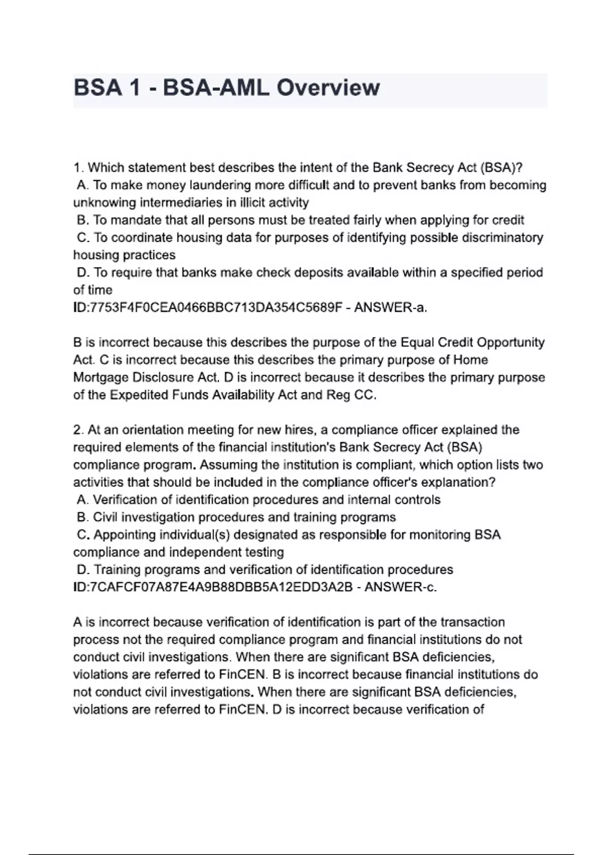 BSA 1 - BSA-AML Overview questions and answers