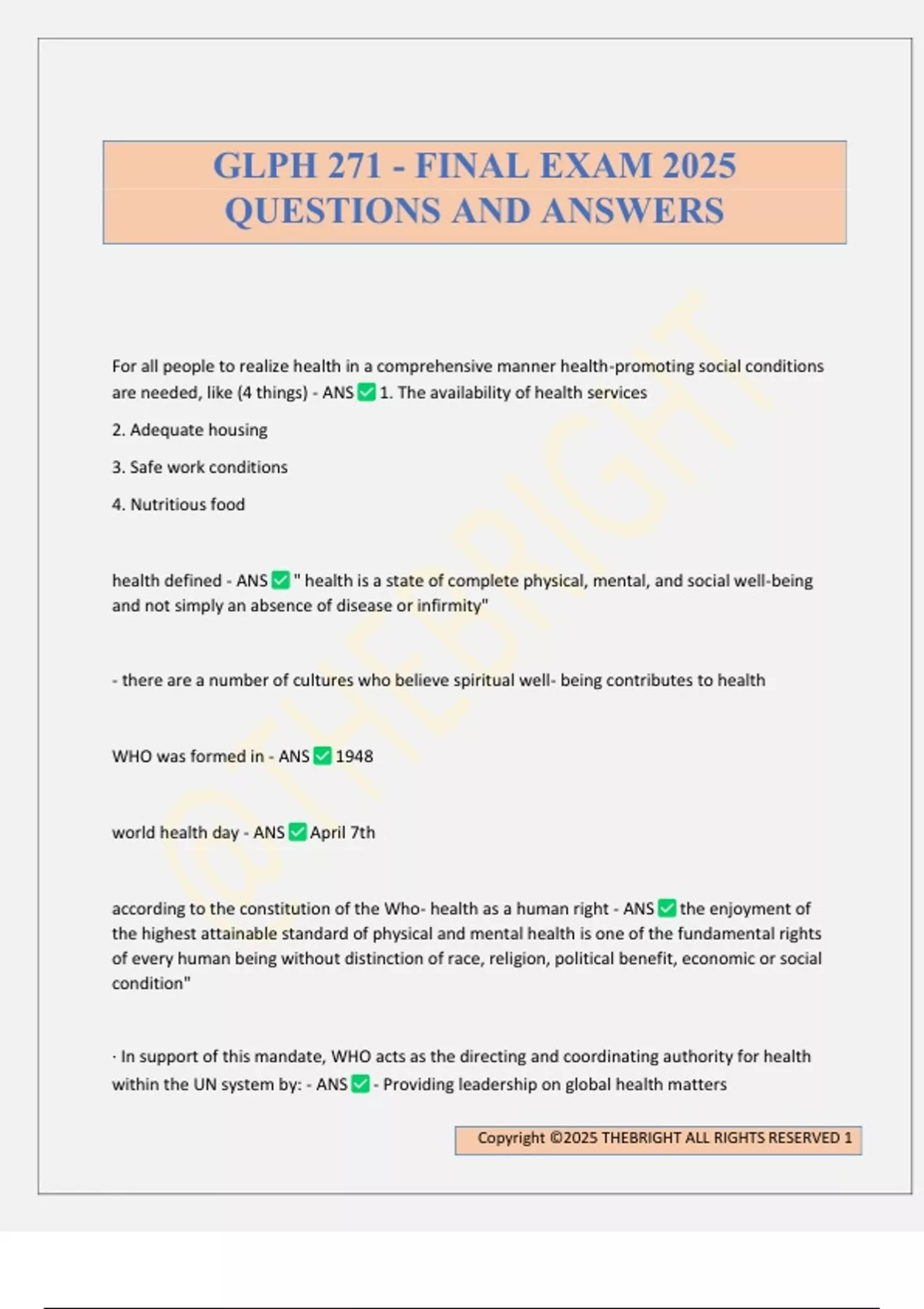 For all people to realize health in a comprehensive manner health-promoting social conditions are needed, like (4 things) - ANS 1. The availability of health services 2. Adequate housing 3. Safe work conditions 4. Nutritious food health defined - ANS " health is a state of complete physical, mental, and social well-being and not simply an absence of disease or infirmity" - there are a number of cultures who believe spiritual well- being contributes to health WHO was formed in - ANS 1948 world health day - ANS April 7th according to the constitution of the Who- health as a human right - ANS the enjoyment of the highest attainable standard of physical and mental health is one of the fundamental rights of every human being without distinction of race, religion, political benefit, economic or social condition" · In support of this mandate, WHO acts as the directing and coordinating authority for health within the UN system by: - ANS - Providing leadership on global health matters GLPH 271 - FINAL EXAM 2025 QUESTIONS AND ANSWERS Copyright ©2025 THEBRIGHT ALL RIGHTS RESERVED 2 - Shaping the health research agenda - Setting norms and standards - Articulating evidence-based policy options - Providing technical support to countries - Monitoring and assessing health trends the health promotion movement of 1980 was fostered by the Who. This movement brought in a new understanding of health because it included the dynamic concept of_____ - ANS Resiliency: the extent to which an individual or group is able to realize aspirations and satisfy needs, and to change or cope with the environment. Health is a resource of everyday life, not the objective of living, it is a positive concept, emphasizing social and personal resources as well as physical capacities ___ + ____ + _____ = resiliency - ANS social support + emotional and mental capabilities + physical strength = resiliency Global health as a discipline was established on the basis of four factors - ANS 1. Decision making based on data and evidence - vital statistics, surveillance and outbreak investigations, laboratory science 2. A focus on populations rather than individuals 3. A goal of social justice and equity 4. An emphasis on prevention rather than curative care What is global health - ANS an area of study, research and practice that places a priority on improving health and achieving equity in health for all people worldwide. Global health emphasizes transnational health issues, determinants, and solutions, involves many disciplines within and beyond the health sciences and promoted interdisciplinary collaboration, and is a synthesis of population based prevention with individual level clinical care Copyright ©2025 THEBRIGHT ALL RIGHTS RESERVED 3 What is public health - ANS the organized efforts of society to keep people healthy and prevent injury, illness and premature death. It is a combination of programs, services and policies that protect and promote the health of all - promoted the highest attainment of health for all people and death with health from a population perspective. Public health ensures that health is addressed early in life and that access to health resources are available as needed public health activities fall under one of the three areas, what are they (3Ps) - ANS 1. Prevention: vaccinations for the flu, immunization programs 2. Promotion: encouraging active transportation, breast feeding initiatives, nutritional education programs 3. Protection: food inspection, evaluating air and water quality Role of public health: aims to keep the population healthy through the following activities (5) - ANS - Health protection - Health promotion - Health and disease surveillance - Disease and injury prevention - Population health assessment social determinant of health definition: - ANS factors that would modify a persons physical, mental, social or spiritual wellbeing - Determinants can be through of as conditions in which people are born, grow, live, work and age they play a key role in determining a populations health Individual social determinants of health (15) - ANS 1. health services 2. social safety net 3. food insecurity 4. social exclusion 5. employment and working conditions Copyright ©2025 THEBRIGHT ALL RIGHTS RESERVED 4 6. race 7. education 8. income and income distribution 9. early life 10. early life 11. housing 12. disability 13. gender 14. Indigenous status 15. Unemployment and job security Factors what influence health (3 main factors) - ANS illness results from the interplay between external fac