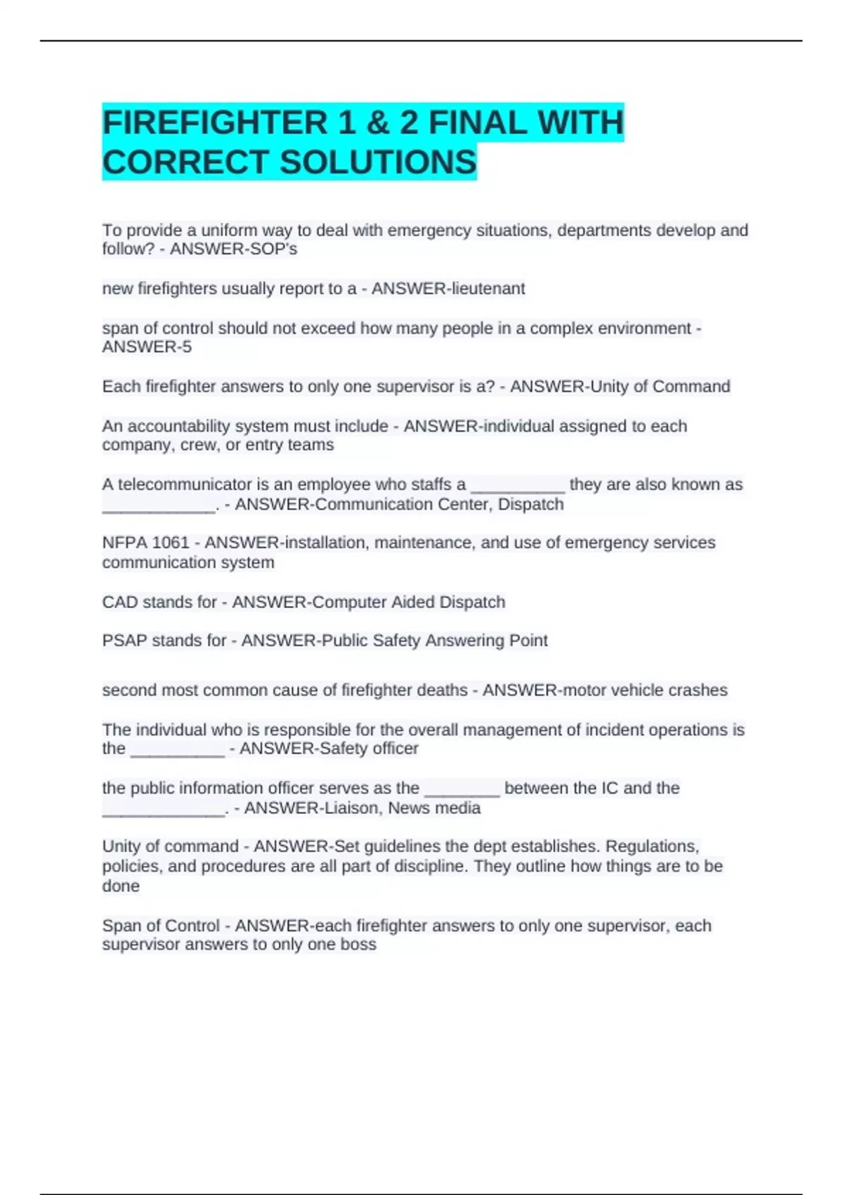 FIREFIGHTER 1 & 2 FINAL WITH CORRECT SOLUTIONSFIREFIGHTER 1 & 2 FINAL WITH CORRECT SOLUTIONSFIREFIGHTER 1 & 2 FINAL WITH CORRECT SOLUTIONSFIREFIGHTER 1 & 2 FINAL WITH CORRECT SOLUTIONS To provide a uniform way to deal with emergency situations, departments develop and follow? - ANSWER-SOP's new firefighters usually report to a - ANSWER-lieutenant span of control should not exceed how many people in a complex environment - ANSWER-5 Each firefighter answers to only one supervisor is a? - ANSWER-Unity of Command An accountability system must include - ANSWER-individual assigned to each company, crew, or entry teams