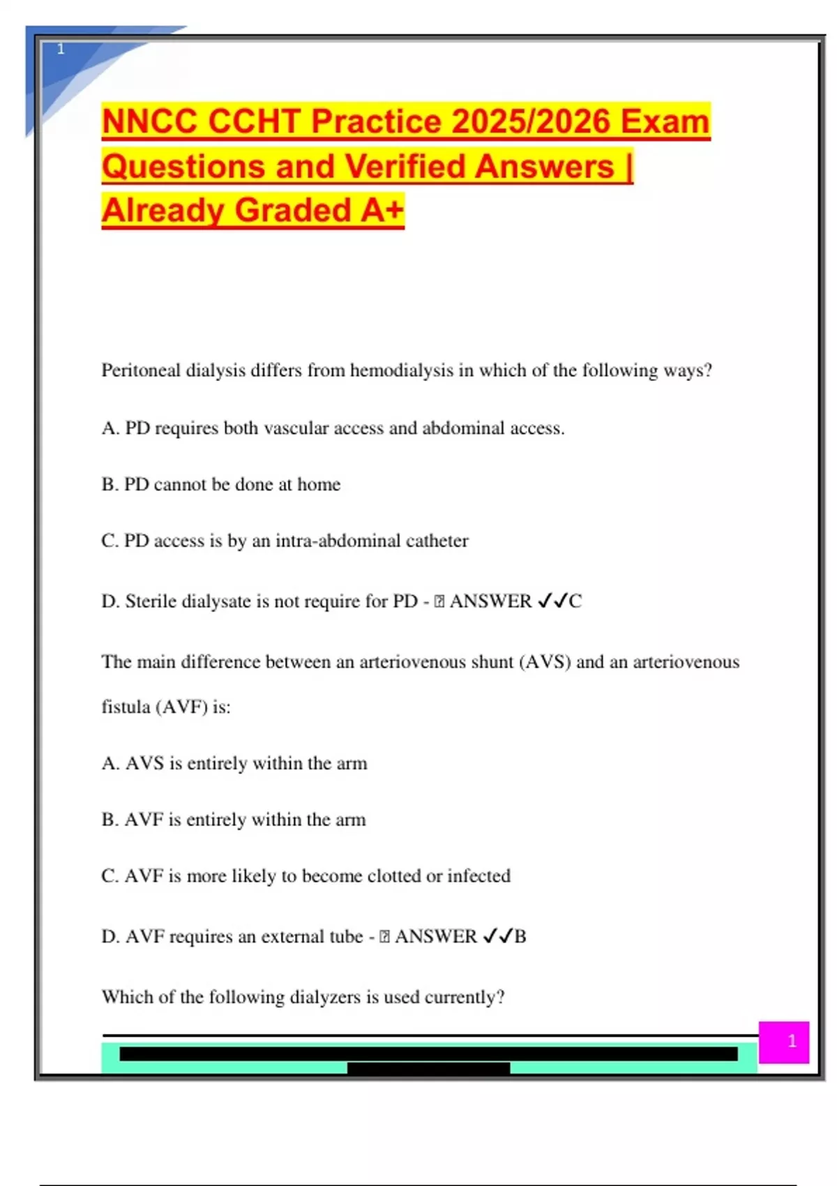 NNCC CCHT Practice 2025/2026 Exam Questions and Verified Answers | Already Graded A+ Peritoneal dialysis differs from hemodialysis in which of the following ways? A. PD requires both vascular access and abdominal access. B. PD cannot be done at home C. PD access is by an intra-abdominal catheter D. Sterile dialysate is not require for PD -