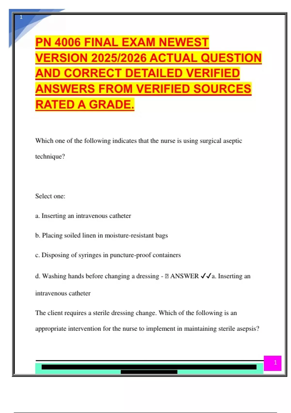 d. Washing hands before changing a dressing - 🧠 ANSWER ✔✔a. Inserting an