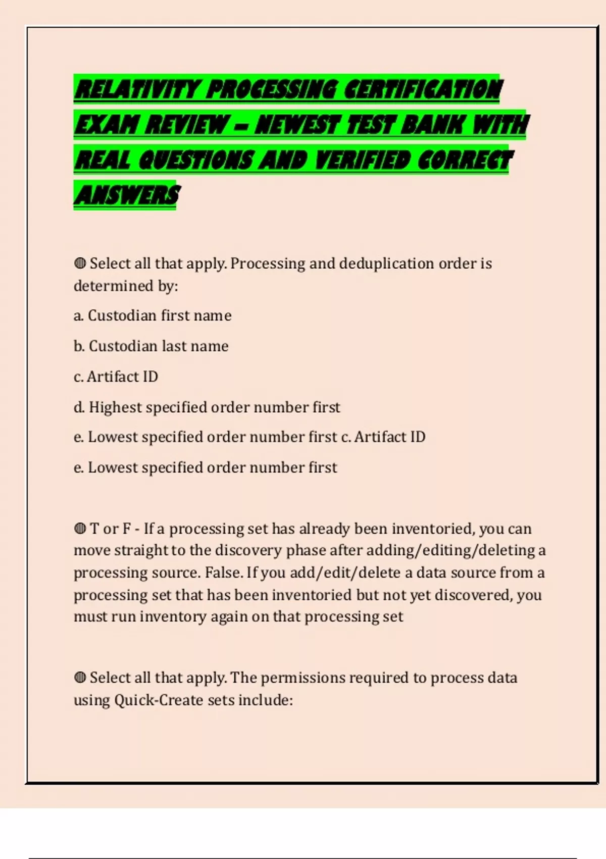RELATIVITY PROCESSING CERTIFICATION EXAM REVIEW – NEWEST TEST BANK WITH REAL QUESTIONS AND VERIFIED CORRECT ANSWERS