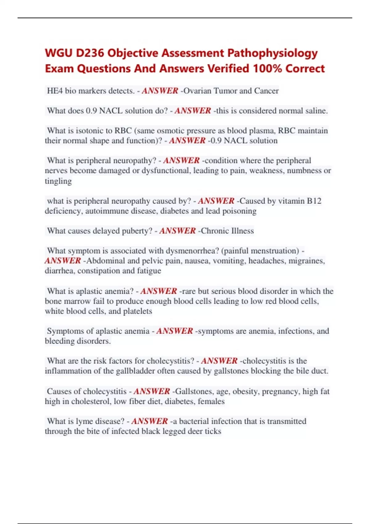 WGU D236 Objective Assessment Pathophysiology Exam Questions And Answers Verified 100% Correct HE4 bio markers detects. - ANSWER -Ovarian Tumor and Cancer What does 0.9 NACL solution do? - ANSWER -this is considered normal saline. What is isotonic to RBC (same osmotic pressure as blood plasma, RBC maintain their normal shape and function)? - ANSWER -0.9 NACL solution What is peripheral neuropathy? - ANSWER -condition where the peripheral nerves become damaged or dysfunctional, leading to pain, weakness, numbness or tingling what is peripheral neuropathy caused by? - ANSWER -Caused by vitamin B12 deficiency, autoimmune disease, diabetes and lead poisoning What causes delayed puberty? - ANSWER -Chronic Illness What symptom is associated with dysmenorrhea? (painful menstruation) - ANSWER -Abdominal and pelvic pain, nausea, vomiting, headaches, migraines, diarrhea, constipation and fatigue What is aplastic anemia? - ANSWER -rare but serious blood disorder in which the bone marrow fail to produce enough blood cells leading to low red blood cells, white blood cells, and platelets Symptoms of aplastic anemia - ANSWER -symptoms are anemia, infections, and bleeding disorders. What are the risk factors for cholecystitis? - ANSWER -cholecystitis is the inflammation of the gallbladder often caused by gallstones blocking the bile duct. Causes of cholecystitis - ANSWER -Gallstones, age, obesity, pregnancy, high fat high in cholesterol, low fiber diet, diabetes, females What is lyme disease? - ANSWER -a bacterial infection that is transmitted through the bite of infected black legged deer ticks What is a stage one symptom of Lyme disease? - ANSWER -bull's eye rash, stage Z= swollen lymph nodes What is the curvature of the spine called? - ANSWER -Lordosis What causes secondary hypertension? - ANSWER -Obstructive sleep apnea What is diffusion? - ANSWER -Molecules move from higher to lower concentrations What is tympanic perforation? - ANSWER -it is a hole or tear in the tympanic membrane (eardrum) which separated the outer ear from the middle ear What does a tympanic perforation cause? - ANSWER -Middle ear infection What is vaso occlusive crisis? - ANSWER -painful episode that occurs in sickle cell anemia hen sickles red blood cells block blood flow in small blood vessels causing severe pain, tissue damage and organ complications. what does vaso occlusive crisis cause in sickle cell anemia? - ANSWER -tissue damage and organ complications symptoms from Vaso occlusive crisis - ANSWER -Dehydration and Acidosis What is RAAS? - ANSWER -renin angiotensin aldosterone system: hormonal system that regulates blood pressure, fluid balance, and electrolyte homeostasis. What does RAAS do? - ANSWER -Maintains circulatory ability by controlling vasoconstriction and sodium retention What is a pouchlike protrusion in the sigmoid? - ANSWER -Diverticulosis What is diverticulosis? - ANSWER -a condition where small pouches form in the walls of the colon. What is fibromyalgia? - ANSWER -chronic condition with musculoskeletal pain, fatigue, sleep disturbances and cognitive difficulties. nervous system disorder Signs and Symptoms - ANSWER -Muscle Weakness, fatigue, recent death in family ca What is the treatment for genital warts? - ANSWER -Cryotherapy, Laser, Electrocautery What is conjunctivitis? - ANSWER -an inflammation of the conjunctiva the clear membrane that covers the white part of the eye and lines the inside of the eyelids. What STI can cause conjunctivitis in a baby being born vaginally? - ANSWER Chlamydia What is pelvic inflammatory disease? - ANSWER -infection of the female reproductive organs including the uterus, fallopian tubes, and ovaries. What STI causes pelvic inflammatory disease? - ANSWER -Chlamydia, Neisseria Gonnorrhoeae What are down syndrome (trisomy 21) variants? - ANSWER -Robertsonian translocation and mosaic syndrome Two afrocentric chromosomes fuse together at their centromeres - ANSWER Robertsonian translocation individual has two or more different sets of DNA within their body. This includes Turner syndrome, down syndrome - ANSWER -Mosaic syndrome What is a rheumatoid factor? - ANSWER -antibody that attacks the body's own tissue what causes rheumatoid factor? - ANSWER -Advanced Maternal Age, Previous baby with Trisomy 21, Parental Consanguinity WHAT IS TRISOMY 21/TRANSLOCATION OF CHROMOSOME 21 - ANSWER -distinctive facial appearance with low nasal bridge, epicanthic folds, protruding tongue, and flat lowest ears Signs of trisomy 21/Translocation of chromosome 21 - ANSWER -poor muscle tone, short stature, congenital heart defects, increased risk for leukemia, systolic heart murmur