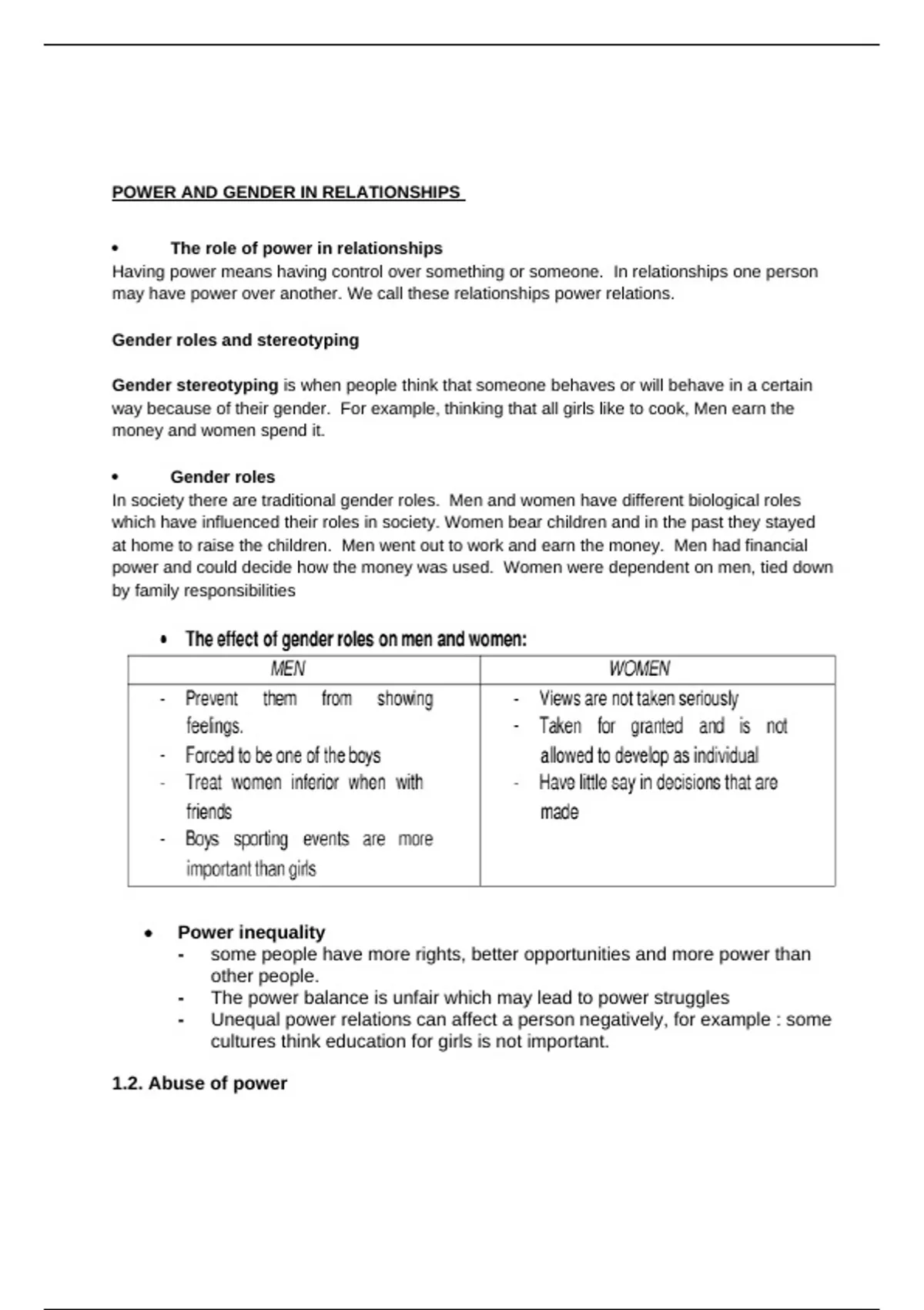 Class notes Life Orientation : Gender inequality in relationships
