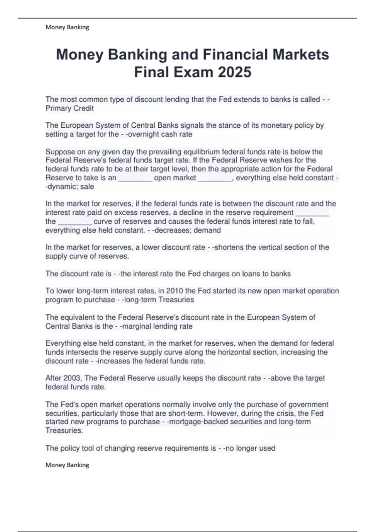The most common type of discount lending that the Fed extends to banks is called - Primary Credit The European System of Central Banks signals the stance of its monetary policy by setting a target for the - -overnight cash rate Suppose on any given day the prevailing equilibrium federal funds rate is below the Federal Reserve's federal funds target rate. If the Federal Reserve wishes for the federal funds rate to be at their target level, then the appropriate action for the Federal Reserve to take is an ________ open market ________, everything else held constant - -dynamic; sale In the market for reserves, if the federal funds rate is between the discount rate and the interest rate paid on excess reserves, a decline in the reserve requirement ________ the ________ curve of reserves and causes the federal funds interest rate to fall, everything else held constant. - -decreases; demand In the market for reserves, a lower discount rate - -shortens the vertical section of the supply curve of reserves. The discount rate is - -the interest rate the Fed charges on loans to banks To lower long-term interest rates, in 2010 the Fed started its new open market operation program to purchase - -long-term Treasuries The equivalent to the Federal Reserve's discount rate in the European System of Central Banks is the - -marginal lending rate Everything else held constant, in the market for reserves, when the demand for federal funds intersects the reserve supply curve along the horizontal section, increasing the discount rate - -increases the federal funds rate. After 2003, The Federal Reserve usually keeps the discount rate - -above the target federal funds rate. The Fed's open market operations normally involve only the purchase of government securities, particularly those that are short-term. However, during the crisis, the Fed started new programs to purchase - -mortgage-backed securities and long-term Treasuries. The policy tool of changing reserve requirements is - -no longer used Money Banking Money Banking Even economists have no single, precise definition of money because - -the "moneyness" or liquidity of an asset is a matter of degree. Compared to interest rates on long-term U.S. government bonds, interest rates on three-month Treasury bills fluctuate ________ and are ________ on average. - -more; lower A rising stock market index due to higher share price - -increases people's wealth and as a result may increase their willingness to spend. Kevin purchasing concert tickets with his debit card is an example of the ________ function of money - -medium of exchange Compared to an economy that uses a medium of exchange, in a barter economy - transaction costs are higher There is a ________ association between inflation and the growth rate of money ________. - -positive; supply When in 1985 a British pound cost approximately $1.30, a Shetland sweater that cost 100 British pounds would have cost $130. With a weaker dollar, the same Shetland sweater would have cost - -more than $130. American farmers who sell beef to Europe benefit most from - -an increase in the dollar price of euros A person's house is part of her - -wealth If an individual uses money from a demand deposit account to purchase a U.S. savings bond - -M1 decreases and M2 decreases A feature of Bitcoin, a new type of electronic money, that make it attractive as a medium of exchange is - -anonymous transactions. Complete Milton Friedman's famous statement, "Inflation is always and everywhere a ________ phenomenon." - -monetary 1 out of 1 points If the price level doubles, the value of money - -falls by 50 percent. Channeling funds from individuals with surplus funds to those desiring funds when the saver does not purchase the borrower's security is known as - -financial intermediation. An electronic payments system has not completely replaced the paper payments system because of all of the following reasons EXCEPT - -transportation costs Money Banking Money Banking The business term for economies of scope is - -synergies The large number of banks in the United States is an indication of - -lack of competition within the banking industry. Financial innovations occur because of financial institutions search for - -profits. The legislation overturning the Glass-Steagall Act is - -the Gramm-Leach-Bliley Act The spectacular growth in international banking can be explained by - -the rapid growth in international trade Eurodollars are - -dollar-denominated deposits at any foreign bank or foreign branch held outside of the US In a ________ banking system, commercial banks engage in securities underwriting, but legal subsidiaries conduct the different activities. Also, banking and insurance are not typically undertaken together in this system. - -British-style universal Adjustable rate mortgages - -benefit homeowners when interest rates are falling Allowing bank branching across state lines gives banks greater ability to coordinate bank operations. This makes it easier for them to receive the benefits of - -economies of scale. Which of the following is a TRUE statement concerning bank holding companies? - Bank holding companies have experienced dramatic growth in the past three decades. The U.S. banking system is considered to be a dual system because - -it is regulated by both state and federal governments. Which of the following statements concerning bank regulation in the United States is TRUE? - -The Federal Reserve and the state banking authorities jointly have responsibility for the state banks that are members of the Federal Reserve System A financial innovation that developed as a result of banks avoidance of bank branching restrictions was - -bank holding companies Bank consolidation will likely result in - -increased competition A major difference between the United States and Japanese banking systems is that - Japanese banks are allowed to hold substantial equity stakes in commercial firms, whereas American banks cannot. Money Bankin