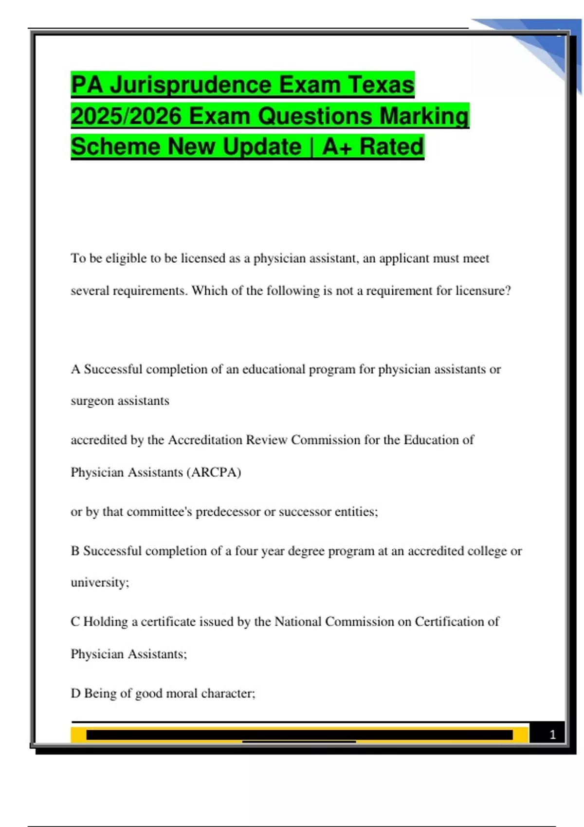 PA Jurisprudence Exam Texas 2025/2026 Exam Questions Marking Scheme New Update | A+ Rated To be eligible to be licensed as a physician assistant, an applicant must meet several requirements. Which of the following is not a requirement for licensure? A Successful completion of an educational program for physician assistants or surgeon assistants accredited by the Accreditation Review Commission for the Education of Physician Assistants (ARCPA) or by that committee's predecessor or successor entities; B Successful completion of a four year degree program at an accredited college or university; C Holding a certificate issued by the National Commission on Certification of Physician Assistants; D Being of good moral character;