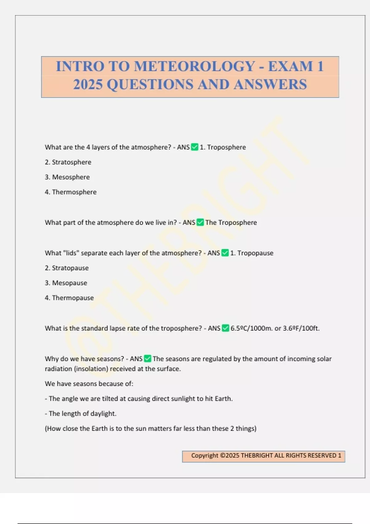 What are the 4 layers of the atmosphere? - ANS 1. Troposphere 2. Stratosphere 3. Mesosphere 4. Thermosphere What part of the atmosphere do we live in? - ANS The Troposphere What "lids" separate each layer of the atmosphere? - ANS 1. Tropopause 2. Stratopause 3. Mesopause 4. Thermopause What is the standard lapse rate of the troposphere? - ANS 6.5ºC/1000m. or 3.6ºF/100ft. Why do we have seasons? - ANS The seasons are regulated by the amount of incoming solar radiation (insolation) received at the surface. We have seasons because of: - The angle we are tilted at causing direct sunlight to hit Earth. - The length of daylight. (How close the Earth is to the sun matters far less than these 2 things) INTRO TO METEOROLOGY - EXAM 1 2025 QUESTIONS AND ANSWERS Copyright ©2025 THEBRIGHT ALL RIGHTS RESERVED 2 Weight - ANS The force acting on an object due to gravity. Mass x Gravity Mass - ANS The quantity of matter in an object. Density - ANS the amount of mass in a given space (volume). Mass/Volume Troposphere - ANS - Surface to about 6-10 miles. - Higher in the summer and tropics. - Temp. decreases with height because it is heated by the surface and not directly by sunlight. - Almost all of what we call weather occurs here. - 80% of Earth's mass is the troposphere. Stratosphere - ANS - Situated between 6.2-8.1mi. and 31mi. - Temp. increases with height because the ozone layer absorbs UV light and warms up as a result - Layered portion of atmosphere. - 99% of the atmospheric mass resides below the stratopause Mesosphere - ANS Up to about 53 miles Thermosphere - ANS - Goes up to about 75mi. - The top layer of the atmosph