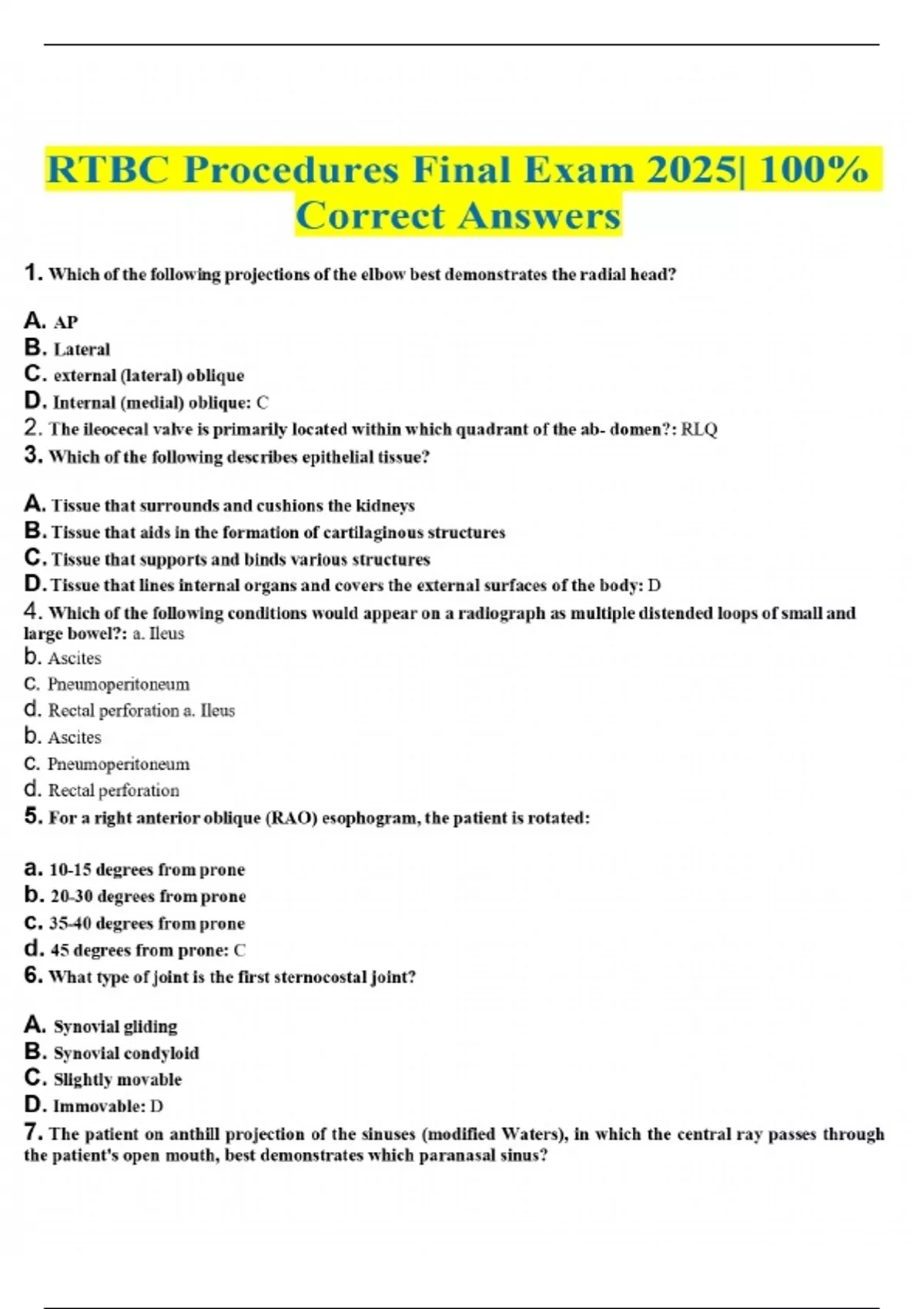 RTBC Procedures Final Exam 2025| 100% Correct Answers 1. Which of the following projections of the elbow best demonstrates the radial head? A. AP B. Lateral C. external (lateral) oblique D. Internal (medial) oblique: C 2. The ileocecal valve is primarily located within which quadrant of the ab- domen?: RLQ 3. Which of the following describes epithelial tissue? A. Tissue that surrounds and cushions the kidneys B. Tissue that aids in the formation of cartilaginous structures C. Tissue that supports and binds various structures D. Tissue that lines internal organs and covers the external surfaces of the body: D