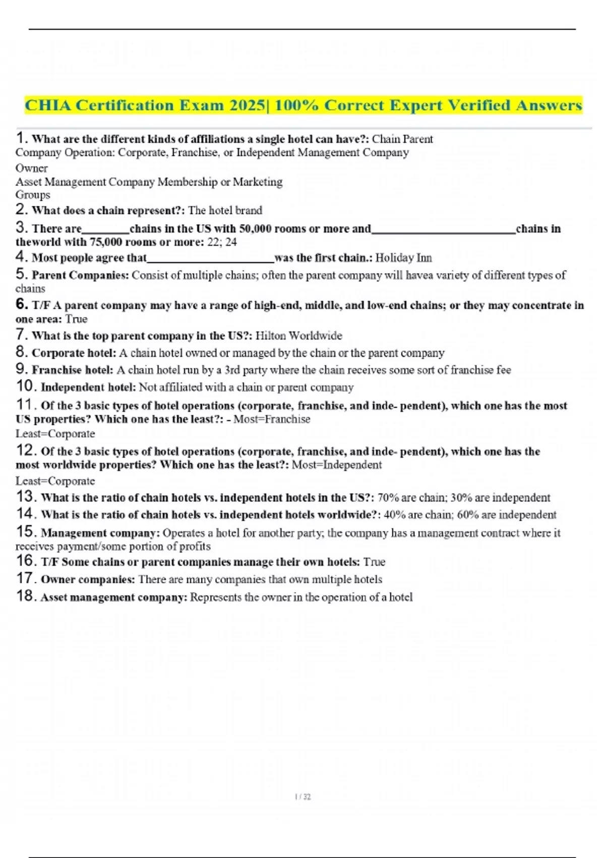 CHIA Certification Exam 2025| 100% Correct Expert Verified Answers 1. What are the different kinds of affiliations a single hotel can have?: Chain Parent Company Operation: Corporate, Franchise, or Independent Management Company Owner Asset Management Company Membership or Marketing Groups 2. What does a chain represent?: The hotel brand 3. There are chains in the US with 50,000 rooms or more and chains in the world with 75,000 rooms or more: 22; 24